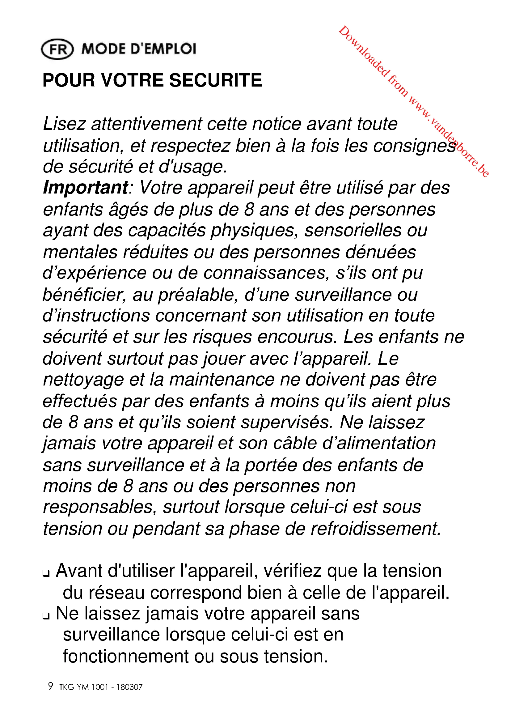 Lisez attentivement cette notice avant toute utilisation, et respectez bien à la fois les consignes de sécurité et d'usage. Important: Votre appareil peut être utilisé par des enfants âgés de plus de 8 ans et des personnes ayant des capacités physiques, sensorielles ou mentales réduites ou des personnes dénuées d’expérience ou de connaissances, s’ils ont pu bénéficier, au préalable, d’une surveillance ou d’instructions concernant son utilisation en toute sécurité et sur les risques encourus. Les enfants ne doivent surtout pas jouer avec l’appareil. Le nettoyage et la maintenance ne doivent pas être effectués par des enfants à moins qu’ils aient plus de 8 ans et qu’ils soient supervisés. Ne laissez jamais votre appareil et son câble d’alimentation sans surveillance et à la portée des enfants de moins de 8 ans ou des personnes non responsables, surtout lorsque celui-ci est sous tension ou pendant sa phase de refroidissement. Avant d'utiliser l'appareil, vérifiez que la tension du réseau correspond bien à celle de l'appareil. Ne laissez jamais votre appareil sans surveillance lorsque celui-ci est en fonctionnement ou sous tension. Downloaded from www.vandenborre.beCopies of the I/B. Please reproduce them without any changes except under special instruction from Team International BELGIUM. The pages must be reproduced and folded in order to obtain a booklet A5 (+/- 148.5 mm width x 210 mm height). When folding, make sure you keep the good numbering when you turn the pages of the I/B. Don’t change the page numbering. Keep the language integrity.