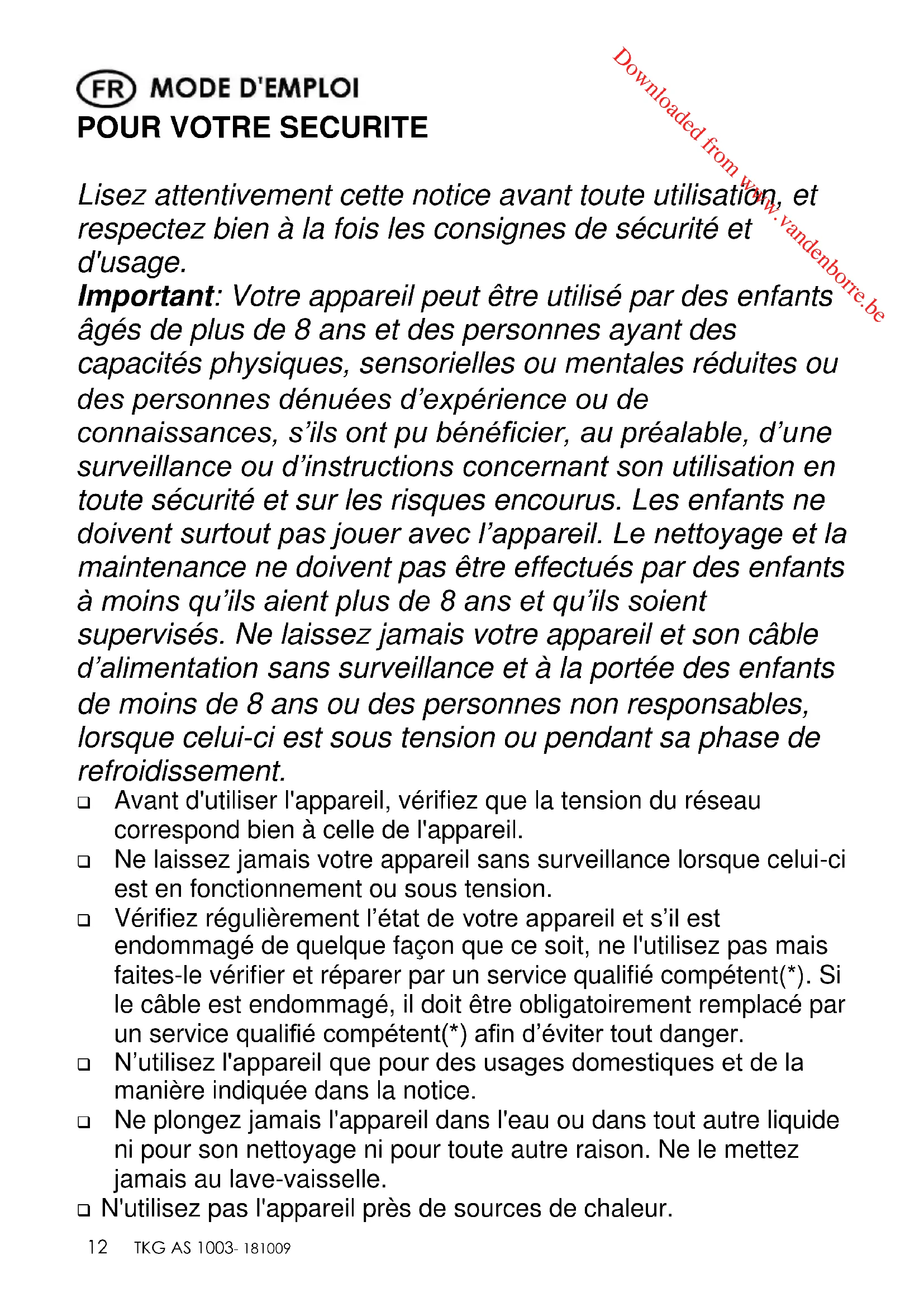 Lisez attentivement cette notice avant toute utilisation, et respectez bien à la fois les consignes de sécurité et d'usage. Important: Votre appareil peut être utilisé par des enfants âgés de plus de 8 ans et des personnes ayant des capacités physiques, sensorielles ou mentales réduites ou des personnes dénuées d’expérience ou de connaissances, s’ils ont pu bénéficier, au préalable, d’une surveillance ou d’instructions concernant son utilisation en toute sécurité et sur les risques encourus. Les enfants ne doivent surtout pas jouer avec l’appareil. Le nettoyage et la maintenance ne doivent pas être effectués par des enfants à moins qu’ils aient plus de 8 ans et qu’ils soient supervisés. Ne laissez jamais votre appareil et son câble d’alimentation sans surveillance et à la portée des enfants de moins de 8 ans ou des personnes non responsables, lorsque celui-ci est sous tension ou pendant sa phase de refroidissement. ❑ Avant d'utiliser l'appareil, vérifiez que la tension du réseau correspond bien à celle de l'appareil. ❑ Ne laissez jamais votre appareil sans surveillance lorsque celui-ci est en fonctionnement ou sous tension. ❑ Vérifiez régulièrement l’état de votre appareil et s’il est endommagé de quelque façon que ce soit, ne l'utilisez pas mais faites-le vérifier et réparer par un service qualifié compétent(*). Si le câble est endommagé, il doit être obligatoirement remplacé par un service qualifié compétent(*) afin d’éviter tout danger. ❑ N’utilisez l'appareil que pour des usages domestiques et de la manière indiquée dans la notice. ❑ Ne plongez jamais l'appareil dans l'eau ou dans tout autre liquide ni pour son nettoyage ni pour toute autre raison. Ne le mettez jamais au lave-vaisselle. ❑ N'utilisez pas l'appareil près de sources de chaleur. Downloaded from www.vandenborre.beCopies of the I/B. Please reproduce them without any changes except under special instruction from Team International BELGIUM. The pages must be reproduced and folded in order to obtain a booklet A5 (+/- 148.5 mm width x 210 mm height). When folding, make sure you keep the good numbering when you turn the pages of the I/B. Don’t change the page numbering. Keep the language integrity.