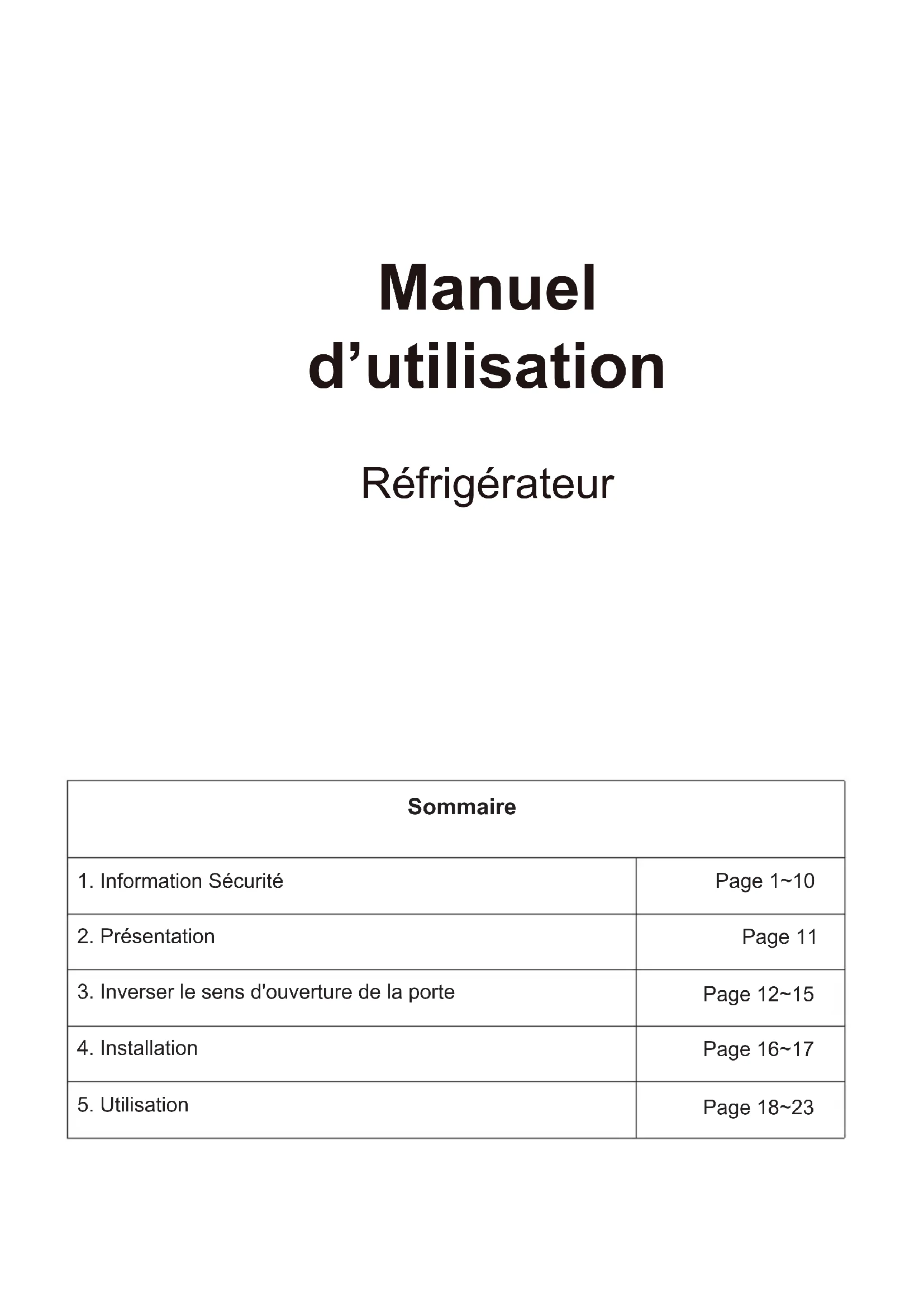 Page 18~23Nous vous remercions d'avoir acheté ce produit. Avant d'utiliser votre réfrigérateur, veuillez lire attentivement ces instructions d'utilisation afin de maximiser ses performances. Conservez cette documentation pour pouvoir vous y référer ultérieurement ou pour les éventuels futurs propriétaires. Ce produit est destiné uniquement à un usage domestique ou autres usages similaires tels que : - l'espace cuisine réservé au personnel dans un magasin, des bureaux ou autres lieux de travail, - dans les fermes-auberges, pour la clientèle des hôtels, motels et autres lieux de type résidentiel, - dans les chambres d'hôtes, - chez la restauration et autres services similaires, ce produit ne convient pas à la vente au détail. Cet appareil d oit être utilisé uniquement pour conserver de la nourriture ; tout autre usage est considéré comme dangereux et le fabricant ne sera pas tenu responsable en cas de mauvaise utilisation. Il est donc recommandé de prendre connaissance des conditions de garantie.