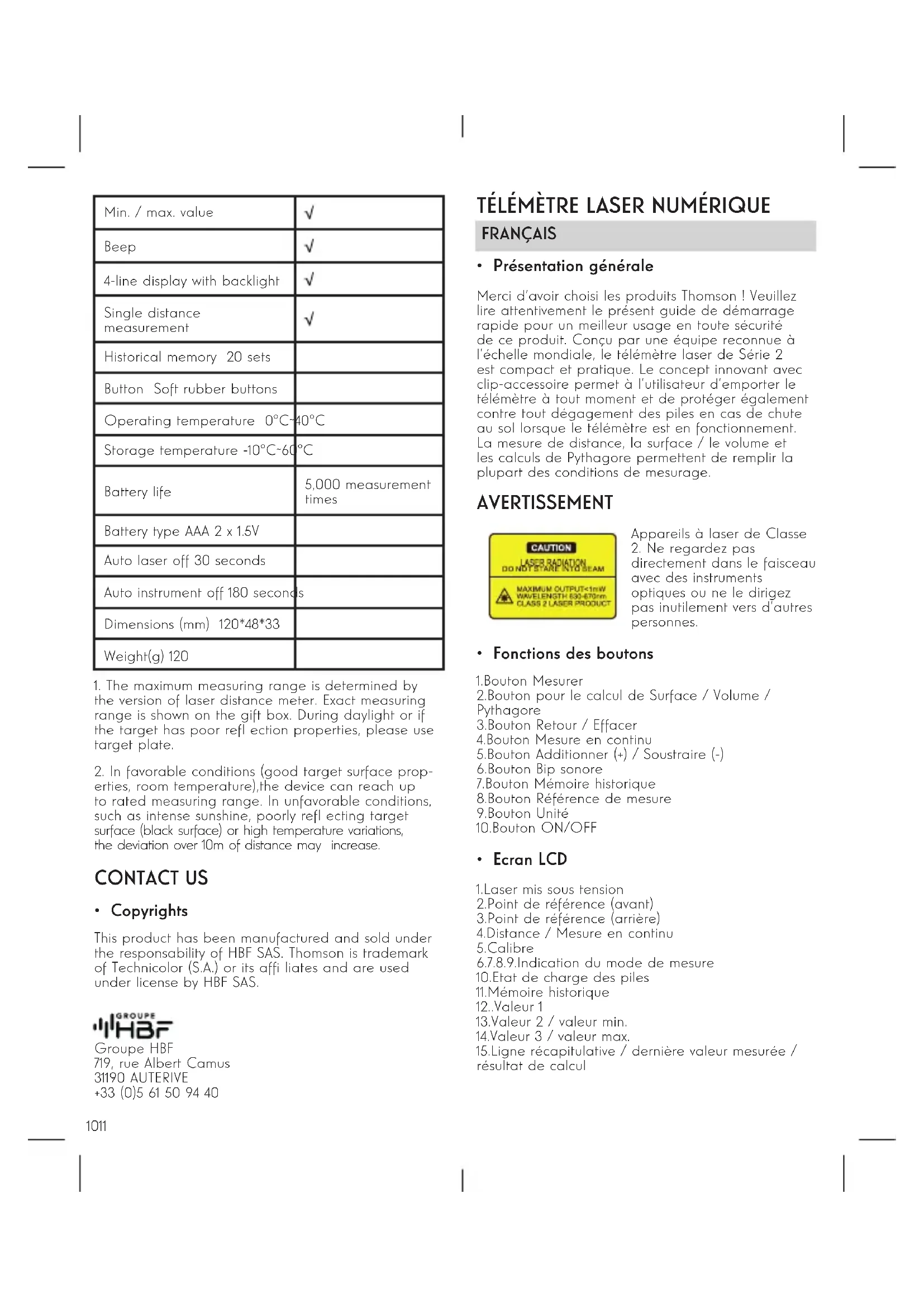 - Copyrights This product has been manufactured and sold under the responsability of HBF SAS. Thomson is trademark of Technicolor (S.A.) or its affi liates and are used under license by HBF SAS. Groupe HBF 719, rue Albert Camus 31190 AUTERIVE +33 (0)5 61 50 94 4012 13 en continu. les distances maximales et minimales mesurées sont affi chées sur l’écran d’affi chage. Le dernière valeur mesurée apparaît sur la ligne récapitulative. Cette fonction s’interrompra automatiquement au bout de 5 minutes d’inactivité. L’utilisateur peut appuyer sur