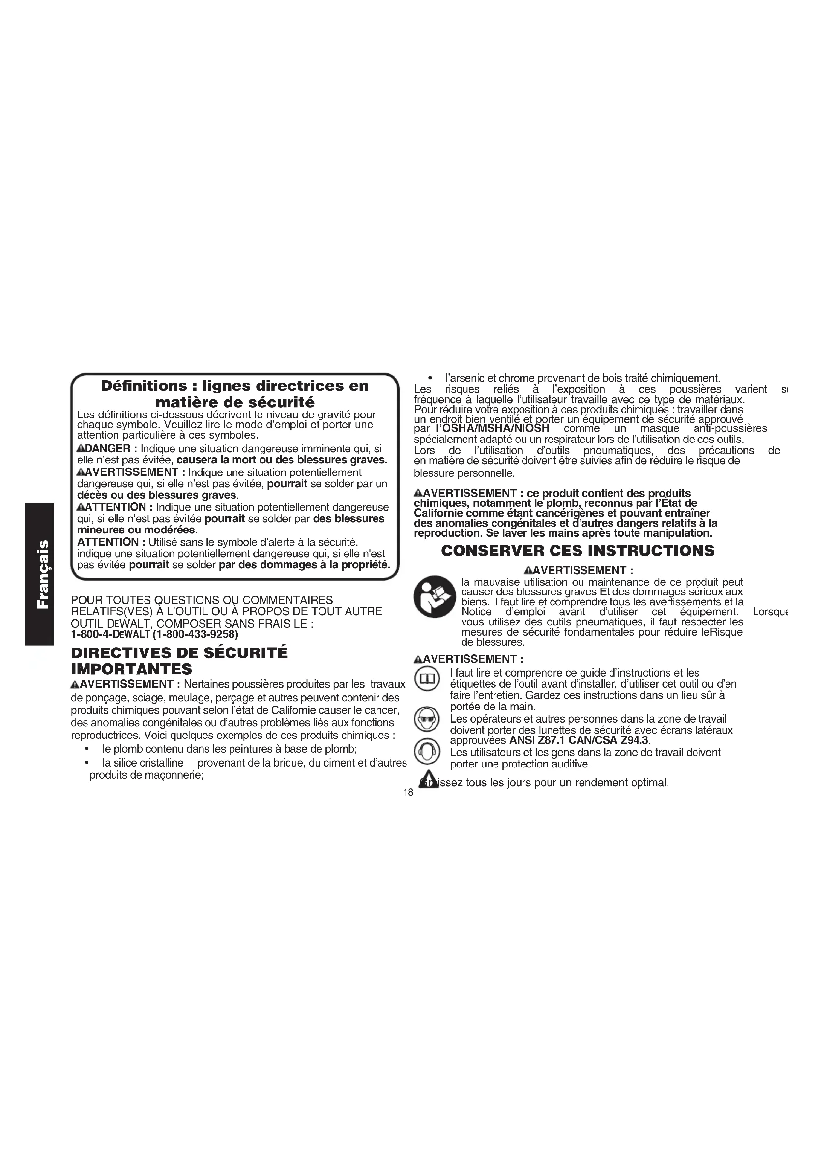 bon équilibre et de tenir l’outil fermement pour contrer les forces ou réactions qui peuvent se produire en utilisant l’outil. 10) Utiliser uniquement des pièces de rechange d’origine Dewalt ou des pièces de qualité équivalente. Ne pas effectuer de réparations temporaires ou permanentes à l’aide de pièces inadéquates.