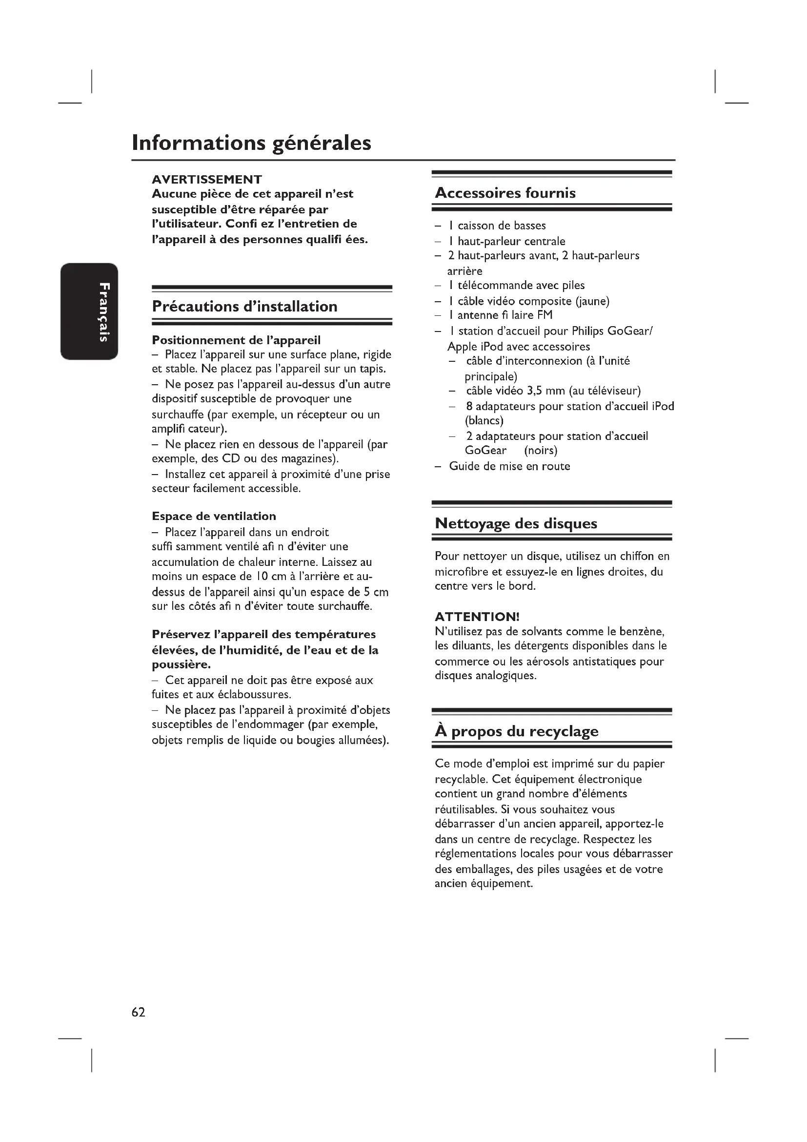 - d’éviter tout accident corporel siobjetexposé fonctionne60 Français Table des matières Informations générales Informations générales p. 62