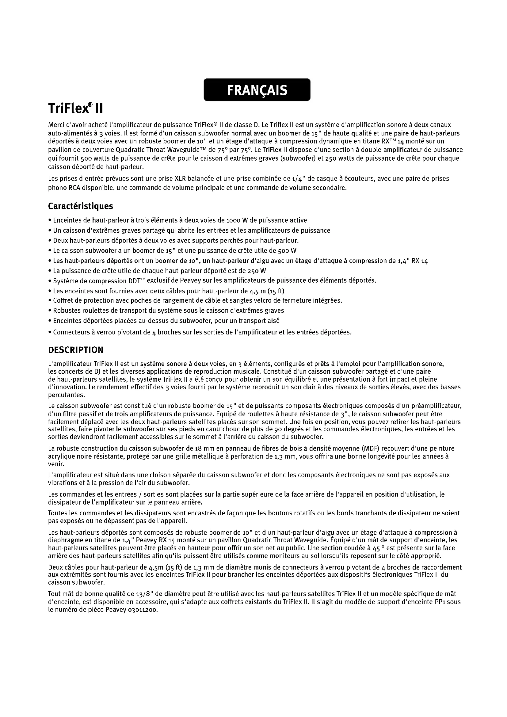 - Connecteurs à verrou pivotant de 4 broches sur les sorties de l'amplificateur et les entrées déportées. DESCRIPTION L'amplificateur TriFlex II est un système sonore à deux voies, en 3 éléments, configurés et prêts à l'emploi pour l'amplification sonore, les concerts de DJ et les diverses applications de reproduction musicale. Constitué d'un caisson subwoofer partagé et d'une paire de haut-parleurs satellites, le système TriFlex II a été conçu pour obtenir un son équilibré et une présentation à fort impact et pleine d'innovation. Le rendement effectif des 3 voies fourni par le système reproduit un son clair à des niveaux de sorties élevés, avec des basses percutantes. Le caisson subwoofer est constitué d'un robuste boomer de 15" et de puissants composants électroniques composés d'un préamplificateur, d'un filtre passif et de trois amplificateurs de puissance. Equipé de roulettes à haute résistance de 3", le caisson subwoofer peut être facilement déplacé avec les deux haut-parleurs satellites placés sur son sommet. Une fois en position, vous pouvez retirer les haut-parleurs satellites, faire pivoter le subwoofer sur ses pieds en caoutchouc de plus de 90 degrés et les commandes électroniques, les entrées et les sorties deviendront facilement accessibles sur le sommet à l'arrière du caisson du subwoofer. La robuste construction du caisson subwoofer de 18 mm en panneau de fibres de bois à densité moyenne (MDF) recouvert d'une peinture acrylique noire résistante, protégé par une grille métallique à perforation de 1,3 mm, vous offrira une bonne longévité pour les années à venir. L'amplificateur est situé dans une cloison séparée du caisson subwoofer et donc les composants électroniques ne sont pas exposés aux vibrations et à la pression de l'air du subwoofer. Les commandes et les entrées / sorties sont placées sur la partie supérieure de la face arrière de l'appareil en position d'utilisation, le dissipateur de l'amplificateur sur le panneau arrière. Toutes les commandes et les dissipateurs sont encastrés de façon que les boutons rotatifs ou les bords tranchants de dissipateur ne soient pas exposés ou ne dépassent pas de l'appareil. Les haut-parleurs déportés sont composés de robuste boomer de 10" et d'un haut-parleur d'aigu avec un étage d'attaque à compression à diaphragme en titane de 1,4" Peavey RX 14 monté sur un pavillon Quadratic Throat Waveguide. Équipé d'un mât de support d'enceinte, les haut-parleurs satellites peuvent être placés en hauteur pour offrir un son net au public. Une section coudée à 45 ° est présente sur la face arrière des haut-parleurs satellites afin qu'ils puissent être utilisés comme moniteurs au sol lorsqu'ils reposent sur le côté approprié. Deux câbles pour haut-parleur de 4,5m (15 ft) de 1,3 mm de diamètre munis de connecteurs à verrou pivotant de 4 broches de raccordement aux extrémités sont fournis avec les enceintes TriFlex II pour brancher les enceintes déportées aux dispositifs électroniques TriFlex II du caisson subwoofer. Tout mât de bonne qualité de 13/8" de diamètre peut être utilisé avec les haut-parleurs satellites TriFlex II et un modèle spécifique de mât d'enceinte, est disponible en accessoire, qui s'adapte aux coffrets existants du TriFlex II. Il s'agit du modèle de support d'enceinte PP1 sous le numéro de pièce Peavey 03011200. FRANÇAIS3 APPLICATIONS Les enceintes Peavey Triflex
