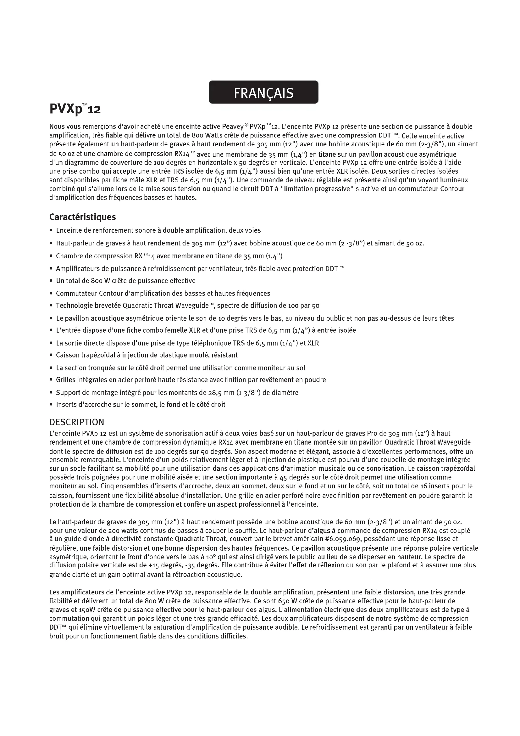 indépendante. Le signal d’entrée est divisé en hautes et basses fréquences par un séparateur électronique du niveau de ligne de pente de quatrième ordre avec pôle étagé à 2,8 kHz. Les basses fréquences sont traitées pour assurer l'amplification des graves, le filtrage subsonique et la mise en forme globale de la réponse et les hautes fréquences sont égalisées pour la mise en forme de la réponse. Le caisson de l'enceinte est réalisé en plastique ABS moulé par injection avec indice de résistance au feu UL et nervures de renfort à l'intérieur. Des poignées sont prévues de chaque côté à hauteur du haut-parleur de graves, à l’avant et sur la droite du caisson. Une grille séparée en métal revêtu de poudre est prévue pour protéger le haut-parleur de graves et le pavillon. Le caisson est doté d’un support à montant pour l'utilisation de l'enceinte sur socle, de quatre pieds surélevés robustes en caoutchouc pour une installation au sol et d’un groupe de quatre inserts de montage en haut, en bas et du côté droit pour la suspension. Les dimensions extérieures sont les suivantes : 24,50" (62,2 cm) de haut x 16,10” (40,9 cm) de large x 15,00” (38,1 cm) de profondeur et le poids est de 43 lbs (17,7 kg). La puissance requise est de : 110 watts (nominale), réseau domestique de 100-120 V AC, 50/60 Hz et 220-240 V AC, 50/60 Hz (Export). Le modèle de l'enceinte est commercialisé sous l'appellation Peavey PVXp