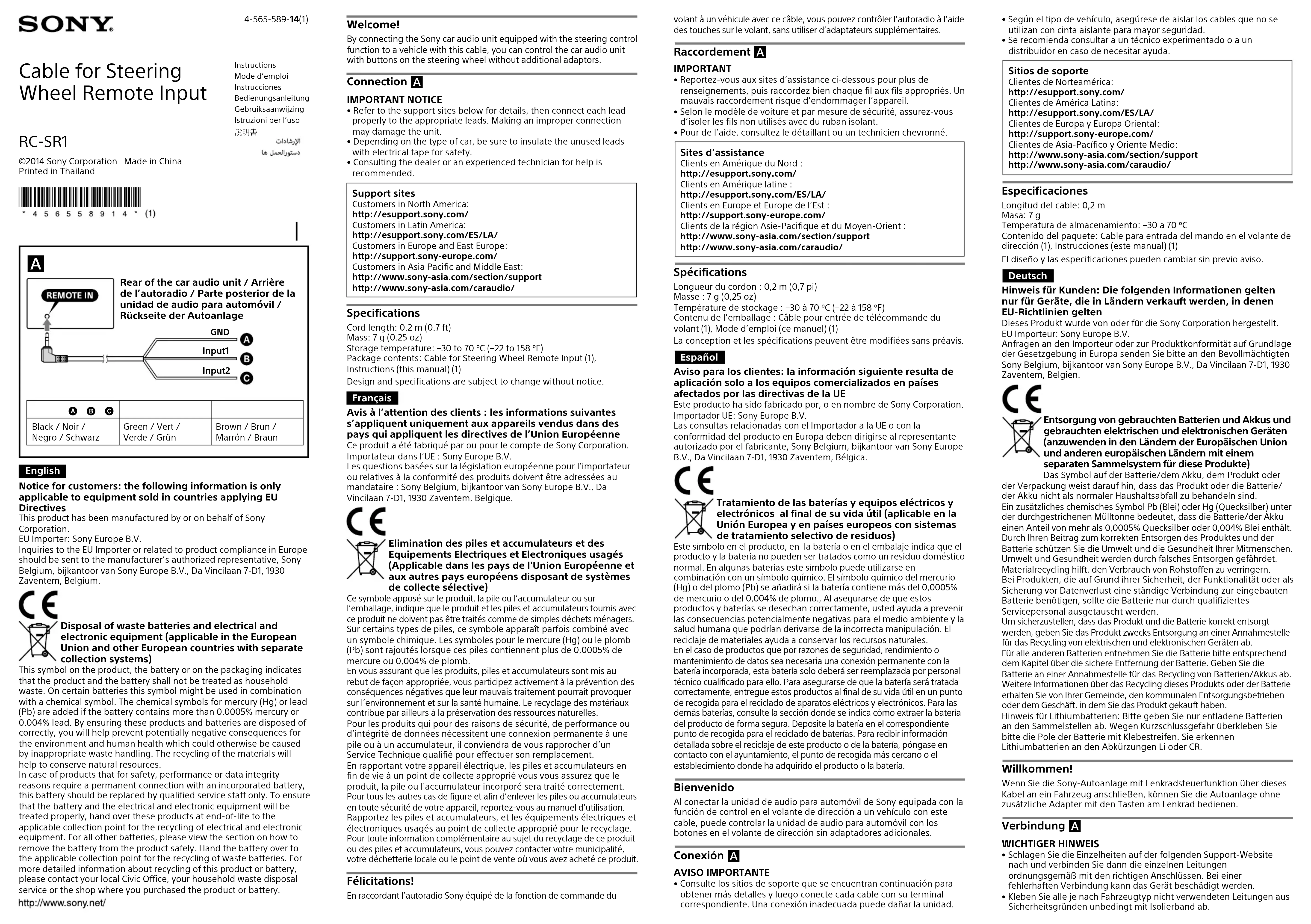 - Consulting the dealer or an experienced technician for help is recommended. Support sites Customers in North America: http://esupport.sony.com/ Customers in Latin America: http://esupport.sony.com/ES/LA/ Customers in Europe and East Europe: http://support.sony-europe.com/ Customers in Asia Pacific and Middle East: http://www.sony-asia.com/section/support http://www.sony-asia.com/caraudio/ Specifications Cord length: 0.2 m (0.7 ft) Mass: 7 g (0.25 oz) Storage temperature: –30 to 70 ºC (–22 to 158 ºF) Package contents: Cable for Steering Wheel Remote Input (1), Instructions (this manual) (1) Design and specifications are subject to change without notice. Français Avis à l’attention des clients : les informations suivantes s’appliquent uniquement aux appareils vendus dans des pays qui appliquent les directives de l’Union Européenne Ce produit a été fabriqué par ou pour le compte de Sony Corporation. Importateur dans l’UE : Sony Europe B.V. Les questions basées sur la législation européenne pour l’importateur ou relatives à la conformité des produits doivent être adressées au mandataire : Sony Belgium, bijkantoor van Sony Europe B.V., Da Vincilaan 7-D1, 1930 Zaventem, Belgique. Elimination des piles et accumulateurs et des Equipements Electriques et Electroniques usagés (Applicable dans les pays de l'Union Européenne et aux autres pays européens disposant de systèmes de collecte sélective) Ce symbole apposé sur le produit, la pile ou l’accumulateur ou sur l’emballage, indique que le produit et les piles et accumulateurs fournis avec ce produit ne doivent pas être traités comme de simples déchets ménagers. Sur certains types de piles, ce symbole apparaît parfois combiné avec un symbole chimique. Les symboles pour le mercure (Hg) ou le plomb (Pb) sont rajoutés lorsque ces piles contiennent plus de 0,0005% de mercure ou 0,004% de plomb. En vous assurant que les produits, piles et accumulateurs sont mis au rebut de façon appropriée, vous participez activement à la prévention des conséquences négatives que leur mauvais traitement pourrait provoquer sur l’environnement et sur la santé humaine. Le recyclage des matériaux contribue par ailleurs à la préservation des ressources naturelles. Pour les produits qui pour des raisons de sécurité, de performance ou d’intégrité de données nécessitent une connexion permanente à une pile ou à un accumulateur, il conviendra de vous rapprocher d’un Service Technique qualifié pour effectuer son remplacement. En rapportant votre appareil électrique, les piles et accumulateurs en fin de vie à un point de collecte approprié vous vous assurez que le produit, la pile ou l'accumulateur incorporé sera traité correctement. Pour tous les autres cas de figure et afin d’enlever les piles ou accumulateurs en toute sécurité de votre appareil, reportez-vous au manuel d’utilisation. Rapportez les piles et accumulateurs, et les équipements électriques et électroniques usagés au point de collecte approprié pour le recyclage. Pour toute information complémentaire au sujet du recyclage de ce produit ou des piles et accumulateurs, vous pouvez contacter votre municipalité, votre déchetterie locale ou le point de vente où vous avez acheté ce produit. Félicitations! En raccordant l’autoradio Sony équipé de la fonction de commande du volant à un véhicule avec ce câble, vous pouvez contrôler l’autoradio à l’aide des touches sur le volant, sans utiliser d’adaptateurs supplémentaires. Raccordement IMPORTANT