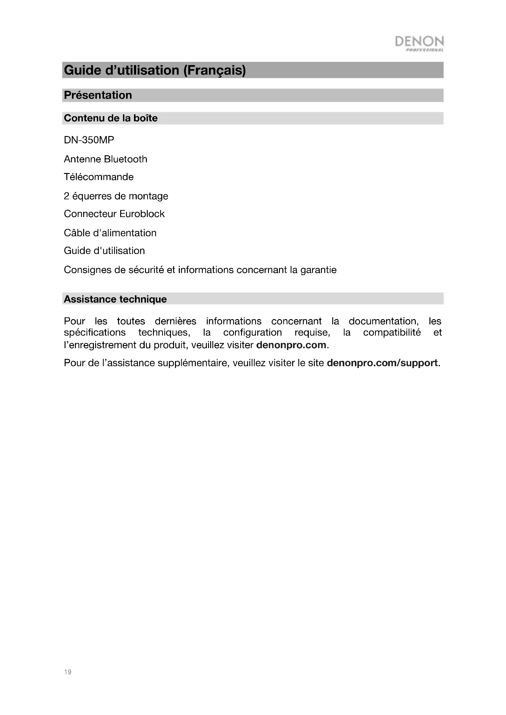 Guide d’utilisation (Français) Présentation Contenu de la boîte DN-350MP Antenne Bluetooth Télécommande 2 équerres de montage Connecteur Euroblock Câble d'alimentation Guide d'utilisation Consignes de sécurité et informations concernant la garantie Assistance technique Pour les toutes dernières informations concernant la documentation, les spécifications techniques, la configuration requise, la compatibilité et l’enregistrement du produit, veuillez visiter denonpro.com. Pour de l’assistance supplémentaire, veuillez visiter le site denonpro.com/support.20