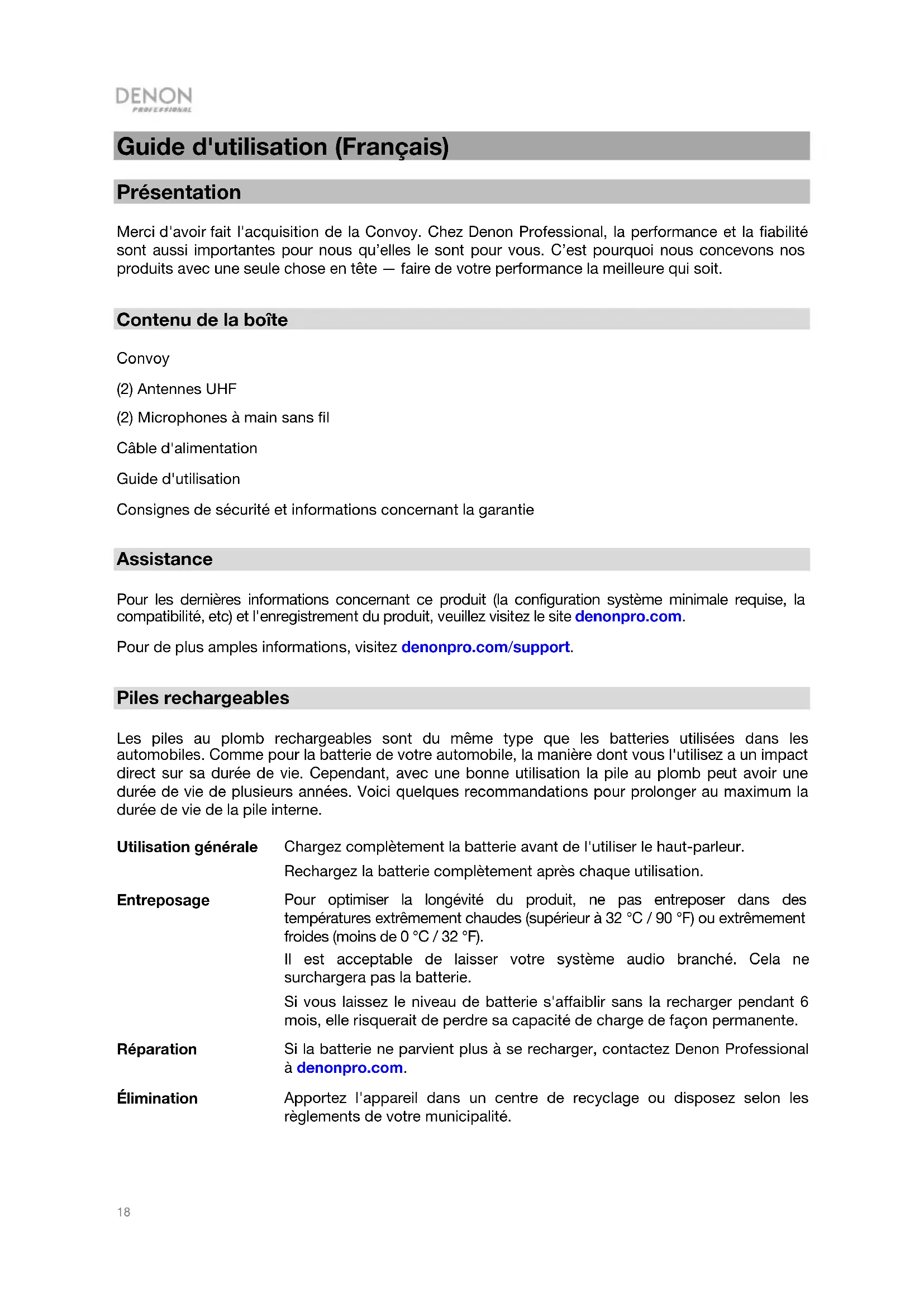 - Reinicie la conexión Bluetooth de su dispositivo de audio apagando el Bluetooth y luego volviendo a encenderlo. Puede encontrar esta opción dentro del menú Bluetooth en los ajustes de su teléfono o dispositivo de audio. Si esto no funciona y ya se había conectado al Convoy anteriormente, busque Convoy en la lista de dispositivos disponibles o previamente conectados en el menú Bluetooth de su dispositivo de audio, toque el icono de engranaje o "i" ubicado junto a él y luego seleccione Desaparear u Olvidar. Apague el Convoy, luego vuelva a encenderlo e intente aparearlo nuevamente una vez que vuelva a aparecer en su lista de dispositivos disponibles. Nota: Si Convoy ya ha sido recientemente apareado con otro dispositivo de audio que aún se encuentre dentro del alcance, es posible que tenga que repetir este proceso con ese dispositivo de audio para desconectarlo completamente.18 Guide d'utilisation (Français) Présentation Merci d'avoir fait l'acquisition de la Convoy. Chez Denon Professional, la performance et la fiabilité sont aussi importantes pour nous qu’elles le sont pour vous. C’est pourquoi nous concevons nos produits avec une seule chose en tête — faire de votre performance la meilleure qui soit. Contenu de la boîte Convoy (2) Antennes UHF (2) Microphones à main sans fil Câble d'alimentation Guide d'utilisation Consignes de sécurité et informations concernant la garantie Assistance Pour les dernières informations concernant ce produit (la configuration système minimale requise, la compatibilité, etc) et l'enregistrement du produit, veuillez visitez le site denonpro.com. Pour de plus amples informations, visitez denonpro.com/support. Piles rechargeables Les piles au plomb rechargeables sont du même type que les batteries utilisées dans les automobiles. Comme pour la batterie de votre automobile, la manière dont vous l'utilisez a un impact direct sur sa durée de vie. Cependant, avec une bonne utilisation la pile au plomb peut avoir une durée de vie de plusieurs années. Voici quelques recommandations pour prolonger au maximum la durée de vie de la pile interne. Utilisation générale Chargez complètement la batterie avant de l'utiliser le haut-parleur. Rechargez la batterie complètement après chaque utilisation. Entreposage Pour optimiser la longévité du produit, ne pas entreposer dans des températures extrêmement chaudes (supérieur à 32 °C / 90 °F) ou extrêmement froides (moins de 0 °C / 32 °F). Il est acceptable de laisser votre système audio branché. Cela ne surchargera pas la batterie. Si vous laissez le niveau de batterie s'affaiblir sans la recharger pendant 6 mois, elle risquerait de perdre sa capacité de charge de façon permanente. Réparation Si la batterie ne parvient plus à se recharger, contactez Denon Professional à denonpro.com. Élimination Apportez l'appareil dans un centre de recyclage ou disposez selon les règlements de votre municipalité.19 Consignes de sécurité importantes Veuillez noter : Denon Professional et inMusic ne sont pas responsables de la mauvaise utilisation de leurs produits ou de l'utilisation faite de ces informations. Denon Professional et inMusic ne sont pas responsables de la mauvaise utilisation de leurs produits causés par le non-respect des procédures d'entretien et d'inspection. Veuillez également consulter le guide des consignes de sécurité et informations concernant la garantie inclus. Caution : Afin de réduire le risque de décharge électrique, veuillez ne pas brancher le Convoy à une prise secteur lorsque la grille est retirée.