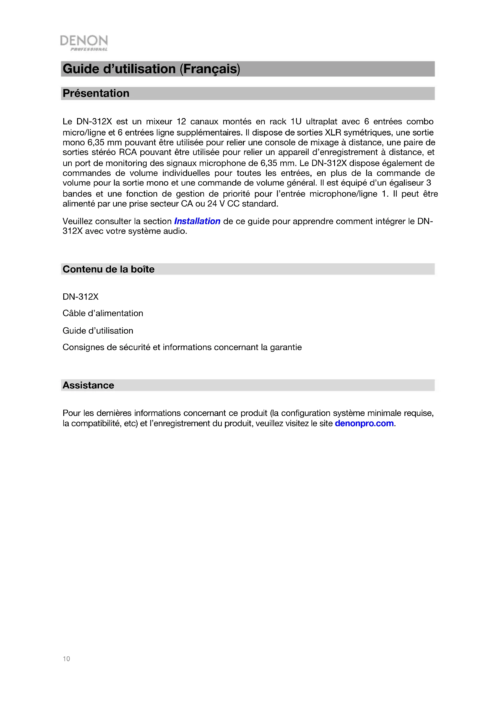 Assistance Pour les dernières informations concernant ce produit (la configuration système minimale requise, la compatibilité, etc) et l’enregistrement du produit, veuillez visitez le site denonpro.com.11