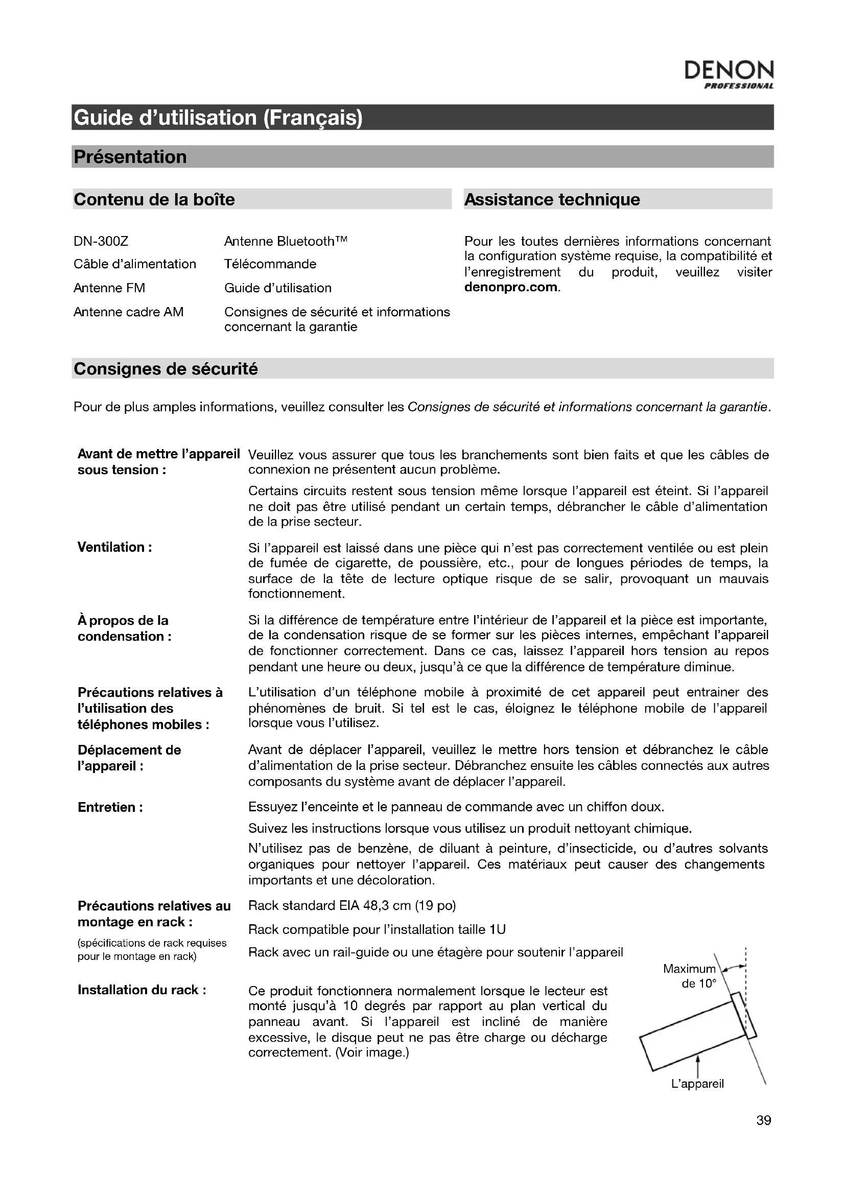 ntenne Bluetooth™ Télécommande Guide d’utilisation Consignes de sécurité et informations concernant la garantie Pour les toutes dernières informations concernant la configuration système requise, la compatibilité et l’enregistrement du produit, veuillez visiter denonpro.com. Consignes de sécurité Pour de plus amples informations, veuillez consulter les Consignes de sécurité et informations concernant la garantie.