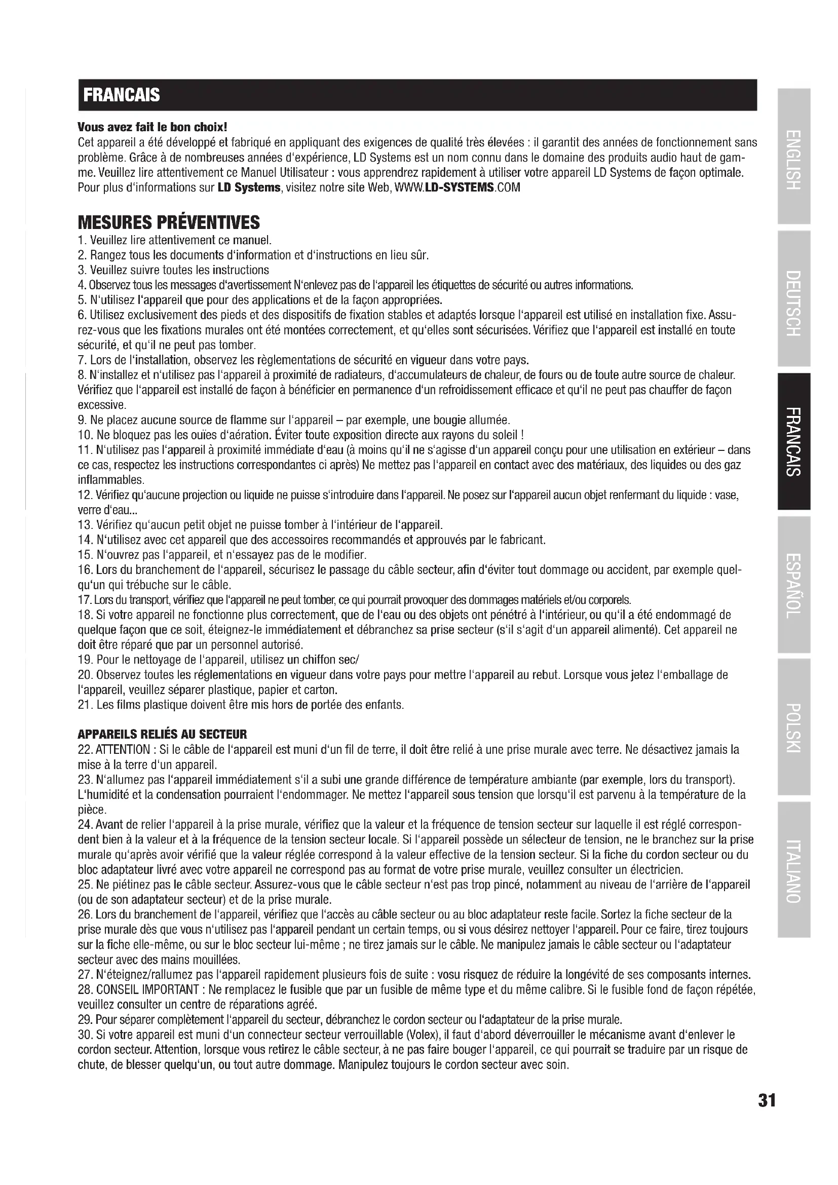 Nos conditions actuelles de garantie et de limitation de responsabilité sont disponibles à l‘adresse suivante : http://www.adamhall.com/me- dia/shop/downloads/documents/manufacturersdeclarations.pdf. Pour les réparations, veuillez contacter Adam Hall GmbH, Daimlerstraße 9, 61267 Neu Anspach / E-Mail Info@adamhall.com / +49 (0)6081 / 9419-0. Vous pouvez nous demander la déclaration de conformité actuel- le à l’adresse info@adamhall.com. TRI ET MISE AUX DÉCHETS CORRECTE DE CE PRODUIT (Applicable dans l‘Union Européenne et les autres pays européens pratiquant le tri des déchets) La présence de ce symbole sur le produit ou sur la documentation correspondante indique qu‘en fin de vie, le produit ne doit pas être jeté avec les déchets normaux, afin d‘éviter tout dommage à l‘environnement ou aux personnes consécutive à une élimination non contrôlée des déchets. Séparez-le des autres types de déchets et recyclez-le, afin de promouvoir la réutilisation durable des ressources naturelles. Nous conseillons aux utilisateurs non professionnels de contacter le revendeur chez qui ils ont acheté le produit, ou un représentant gouvernemental local, pour plus de détails sur le lieu de collecte et la façon de recycler cet appareil dans le meilleur respect de l‘environnement possible.. Nous invitons les utilisateurs professionnels à contacter leur fournisseur et à vérifier les termes et conditions de leur contrat d‘achat. Ce produit ne doit pas être mélangé à d‘autres déchets commerciaux lors de la collecte.45 ITALIANO POLSKI ESPAÑOL FRANCAIS DEUTSCH ENGLISH ESPAÑOL ¡Gracias por elegir LD-Systems! Este equipo está diseñado y fabricado con los estándares de calidad más exigentes, para garantizar un correcto funcionamiento durante muchos años. Los productos de LD-Systems se caracterizan por su gran calidad, avalada por el prestigio de la marca y una dilatada expe- riencia como fabricante. Lea atentamente este manual de usuario para poder aprovechar rápidamente toda la funcionalidad de su nuevo producto de LD Systems. Si desea obtener información sobre LD-SYSTEMS, visite nuestro sitio web WWW.LD-SYSTEMS.COM
