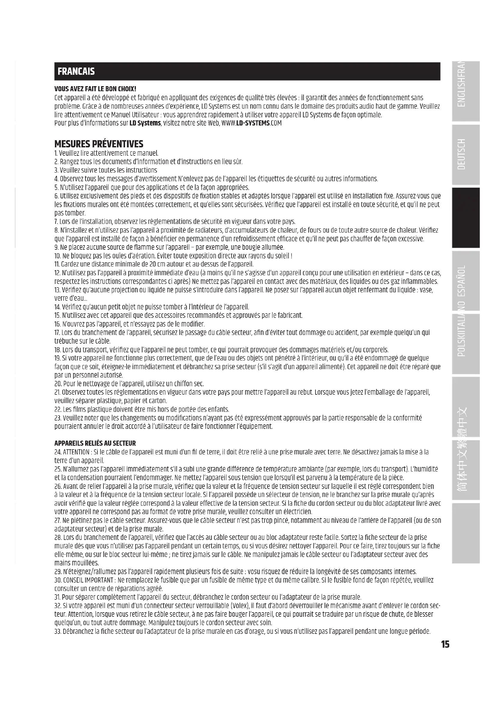 FRANCAIS VOUS AVEZ FAIT LE BON CHOIX! Cet appareil a été développé et fabriqué en appliquant des exigences de qualité très élevées : il garantit des années de fonctionnement sans problème. Grâce à de nombreuses années d‘expérience, LD Systems est un nom connu dans le domaine des produits audio haut de gamme. Veuillez lire attentivement ce Manuel Utilisateur : vous apprendrez rapidement à utiliser votre appareil LD Systems de façon optimale. Pour plus d‘informations sur LD Systems, visitez notre site Web, WWW.LD-SYSTEMS.COM