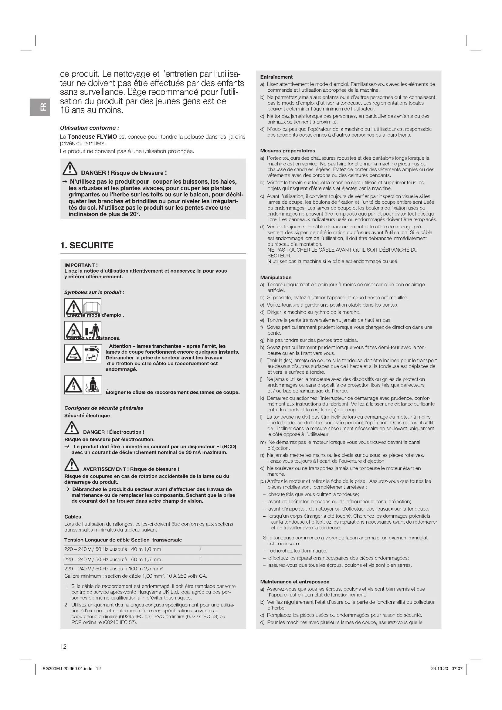 ) Arrêtez le moteur et retirez la fiche de la prise. Assurez-vous que toutes les pièces mobiles sont complètement arrêtées : – chaque fois que vous quittez la tondeuse; – avant de libérer les blocages ou de déboucher le canal d’éjection; – avant d’inspecter, de nettoyer ou d’effectuer des travaux sur la tondeuse; – lorsqu’un corps étranger a été touché. Cherchez les dommages potentiels sur la tondeuse et effectuez les réparations nécessaires avant de redémarrer et de travailler avec la tondeuse. Si la tondeuse commence à vibrer de façon anormale, un examen immédiat est nécessaire : – recherchez les dommages; – effectuez les réparations nécessaires des pièces endommagées; – assurez-vous que tous les écrous, boulons et vis sont bien serrés. Maintenance et entreposage a) Assurez-vous que tous les écrous, boulons et vis sont bien serrés et que l’appareil est en bon état de fonctionnement. b) Vérifiez régulièrement l’état d’usure ou la perte de fonctionnalité du collecteur d’herbe. c) Remplacez les pièces usées ou endommagées pour raison de sécurité. d) Pour les machines avec plusieurs lames de coupe, assurez-vous que le ce produit. Le nettoyage et l’entretien par l’utilisa- teur ne doivent pas être effectués par des enfants sans surveillance. L’âge recommandé pour l’utili- sation du produit par des jeunes gens est de 16ans au moins. Utilisation conforme: La Tondeuse FLYMO est conçue pour tondre la pelouse dans les jardins privés ou familiers. Le produit ne convient pas à une utilisation prolongée. DANGER! Risque de blessure! v N’utilisez pas le produit pour couper les buissons, les haies, les arbustes et les plantes vivaces, pour couper les plantes grimpantes ou l’herbe sur les toits ou sur le balcon, pour déchi- queter les branches et brindilles ou pour niveler les irrégulari- tés du sol. N’utilisez pas le produit sur les pentes avec une inclinaison de plus de 20°. SG300EU-20.960.01.indd 12 24.10.20 07:07FR