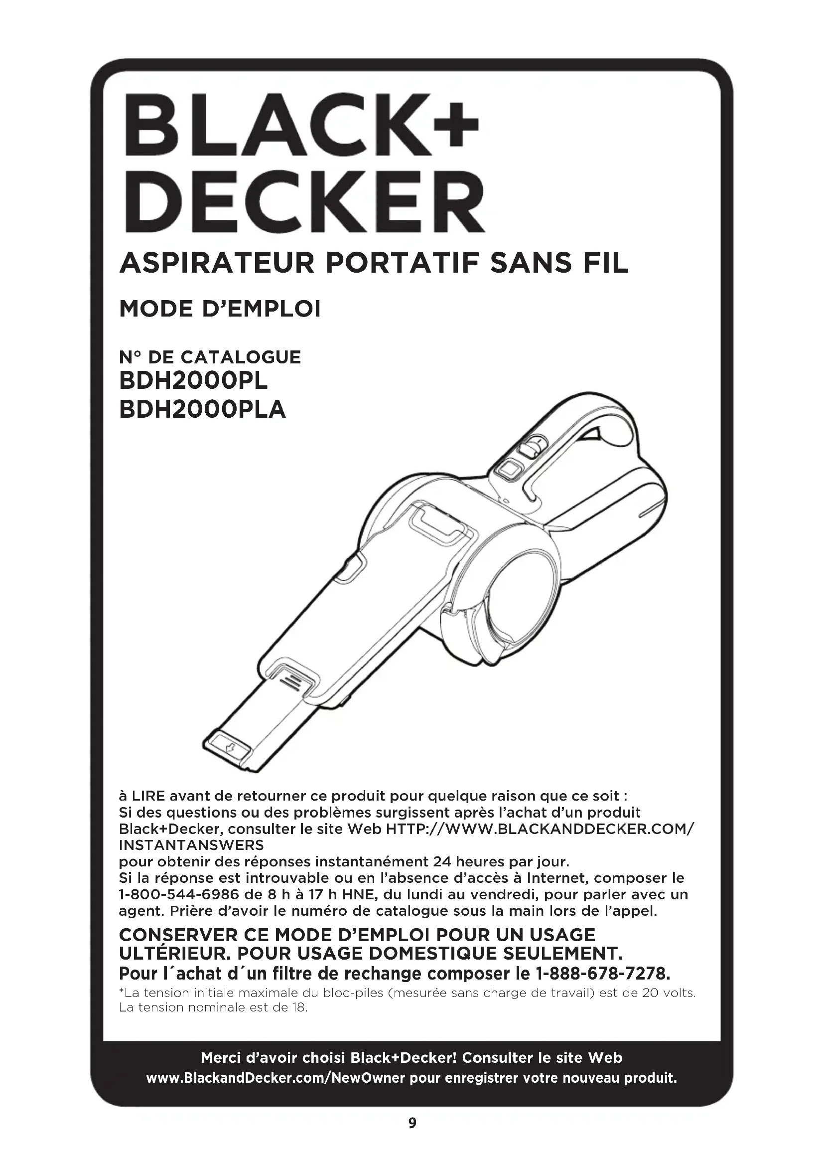 àLIRE avant de retourner ce produit pour quelque raison que ce soit : Si des questions ou des problèmes surgissent après l’achat d’un produit Black+Decker, consulter le site Web HTTP://WWW.BLACKANDDECKER.COM/INSTANTANSWERS pour obtenir des réponses instantanément 24 heures par jour.Si la réponse est introuvable ou en l’absence d’accès à Internet, composer le 1-800-544-6986 de 8 h à 17 h HNE, du lundi au vendredi, pour parler avec un agent. Prière d’avoir le numéro de catalogue sous la main lors de l’appel. CONSERVER CE MODE D’EMPLOI POUR UN USAGE ULTÉRIEUR. POUR USAGE DOMESTIQUE SEULEMENT. Pour l´achat d´un filtre de rechange composer le 1-888-678-7278. *La tension initiale maximale du bloc-piles (mesurée sans charge de travail) est de 20 volts. La tension nominale est de 18.Merci d’avoir choisi Black+Decker! Consulter le site Webwww.BlackandDecker.com/NewOwner pour enregistrer votre nouveau produit.