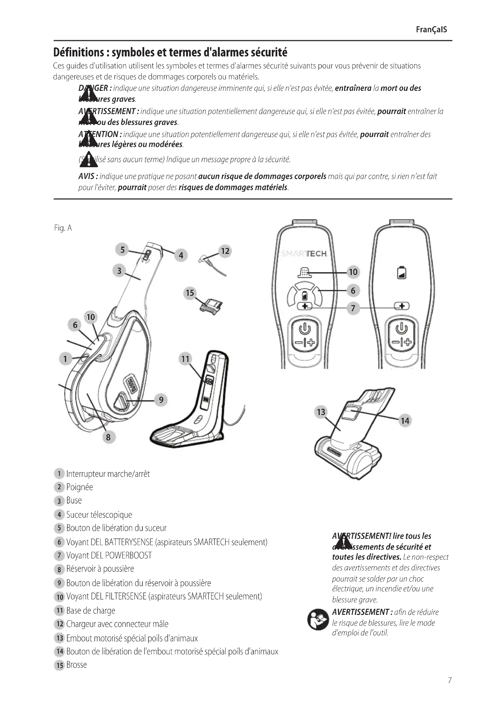 Figure D Mode POWERBOOST Le voyant DEL vert s’allume lorsque l’appareil est en mode POWERBOOST, permettant ainsi de le faire fonctionner en puissance réduite pour préserver la durée d’utilisation du bloc-piles. FILTERSENSE Chaque fois que le filtre est obstrué et nécessite un nettoyage, le voyant DEL rouge sur la poignée s’allume. Éliminez alors la poussière du filtre (se reporter à la section «Entretien du réservoir à poussière et du filtre»). Buse/Accessoires