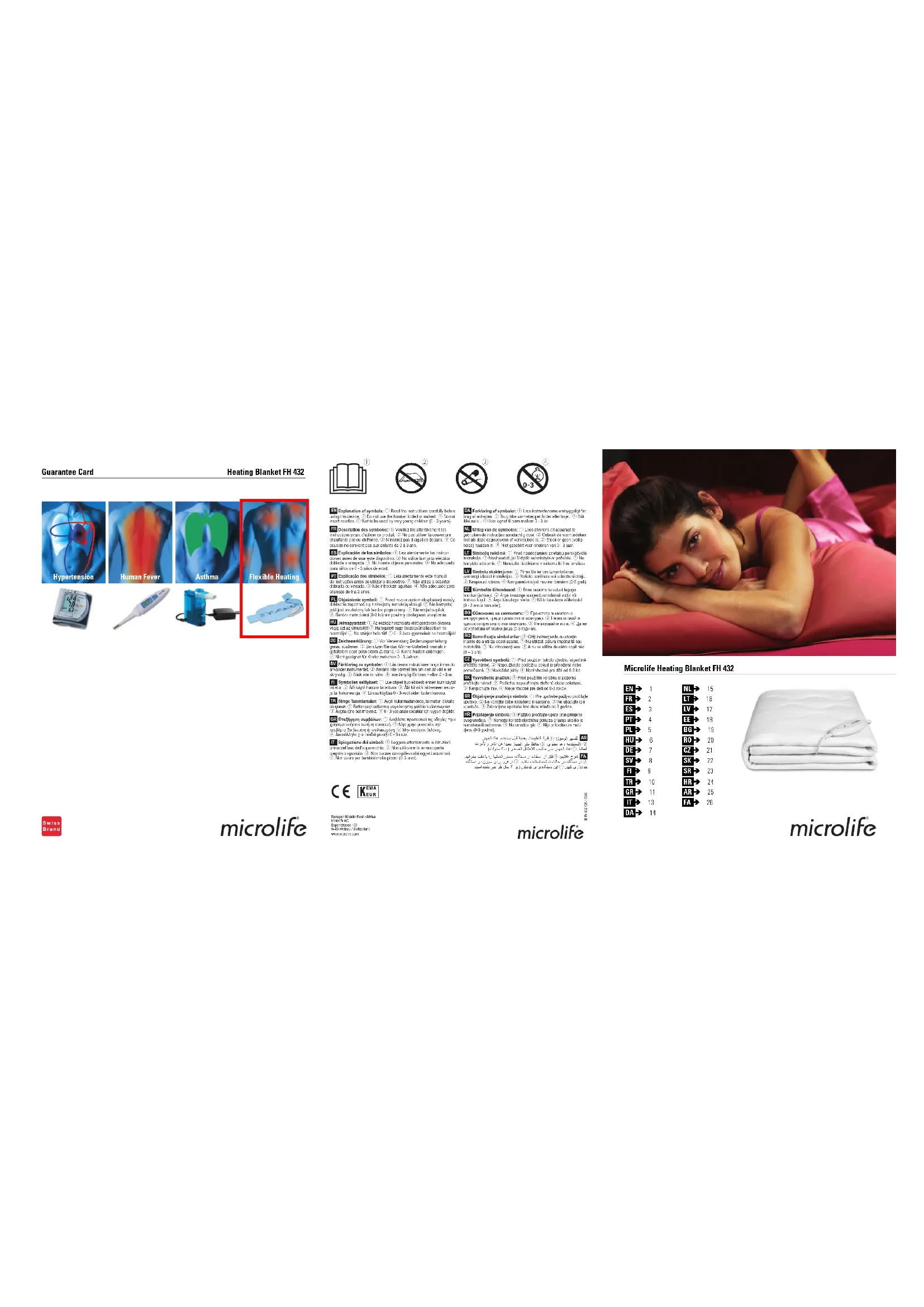 ΕγυϭϔΣϣϧϓΕέϳϳϐΗϕΣ ϑϳϻϭέϳΎϣΕϳΎγ ΕϳΎγέΩΩϳϧϭΗϣέΎϣΕΎϣΩΧϭΕϻϭλΣϣΩέϭϣέΩϕϳϗΩΕΎϋϼρ ΩϳέϭΕγΩΑwww.microlife.comΗϧέΗϧϳ2FH 432 Veuillez lire ce manuel attentivement avant d'utiliser ce produit.• Ce produit ne se destine pas à une application médicale en milieu hospitalier. Il est réservé à un usage domestique.• Utilisez la couverture chauffante comme sous couverture seulement:- Cet appareil ne peut être utilisé qu’avec la télécommande FH 432. - Evitez toute utilisation en cas d'humidité. Toute couverture chauffante humide ou mouillée doit être parfaitement séchée avant l'utilisation.- Ne l'utilisez pas si elle est pliée.- Ne l'utilisez pas si elle est fortement froissée.