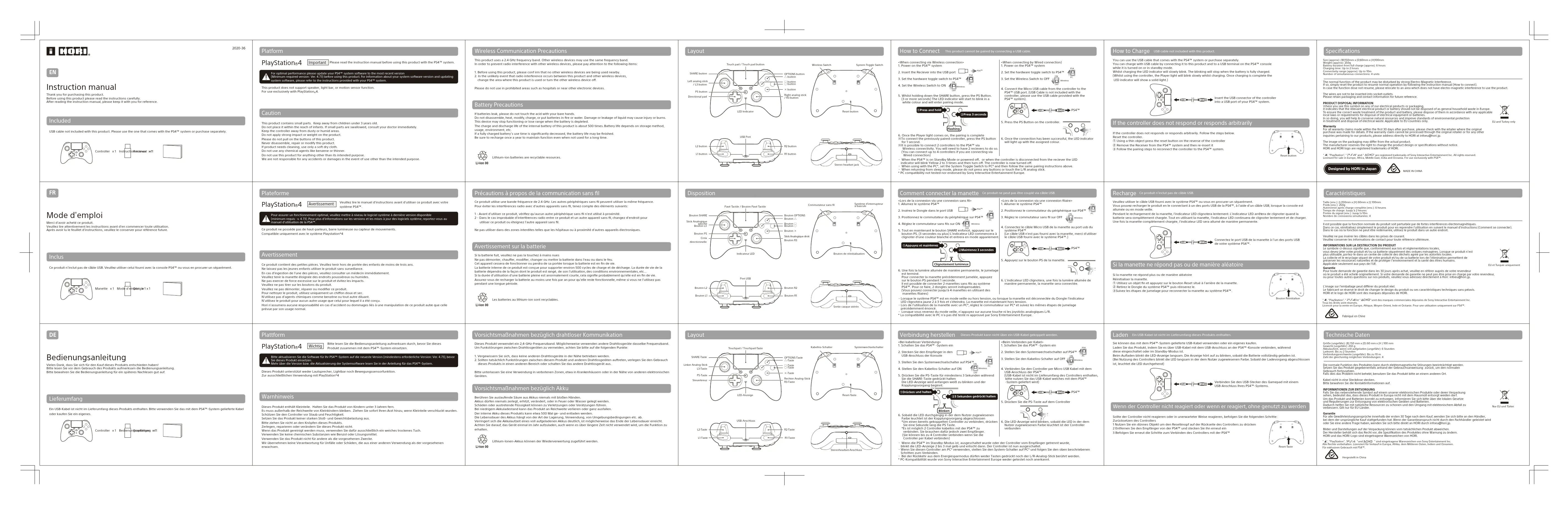 Pourassurerunfonctionnementoptimal,veuillezmettreàniveaulelogicielsystèmeàdernièreversiondisponible (minimumrequis:v.4.73).Pourplusd'informationssurlesversionsetlesmisesàjourdeslogicielssystème,reportez-vousau manueld'utilisationdelaPS4™.Ceproduitnepossèdepasdehaut-parleurs,barrelumineuseoucapteurdemouvements.CompatibleuniquementaveclesystèmePlaystation®4Ceproduitcontientdespetitespièces.Veuilleztenirhorsdeportéedesenfantsdemoinsdetroisans.Nelaissezpaslesjeunesenfantsutiliserleproduitsanssurveillance.Encasd'ingestiondel'unedespièces,veuillezconsulterunmédecinimmédiatement.Veuilleztenirlamanetteéloignéedesendroitspoussiéreuxouhumides.Nepasexercerdeforceexcessivesurleproduitetévitezlesimpacts.Veuilleznepastirersurlesboutonsduproduit.Veuilleznepasdémonter,répareroumodifierceproduit.Pournettoyerleproduit,utilisezuniquementunchiffondouxetsec.N'utilisezpasd'agentschimiquescommebenzèneoutoutautrediluant.Nʼutilisezleproduitpouraucunautreusagequeceluipourlequelilaétéconçu. Horin'assumeraaucuneresponsabilitéencasdʼaccidentoudommagesliésàunemanipulationdeceproduitautrequecelle prévueparsonusagenormal. Avertissement Précautionsàproposdelacommunicationsansfil Avertissementsurlabatterie Ceproduitutiliseunebandefréquencede2.4GHz.Lesautrespériphériquessansfilpeuventutiliserlamêmefréquence.Pouréviterlesinterférencesradioavecd'autresappareilssansfil,tenezcomptedesélémentssuivants:1-Avantd'utiliserceproduit,vérifiezqu'aucunautrepériphériquesansfiln'estutiliséàproximité. 2-Danslecasimprobabled'interférencesradioentreceproduitetunautreappareilsansfil,changezd'endroitpour utiliserceproduitouéteignezl'autreappareilsansfil.Nepasutiliserdansdeszonesinterditestellesqueleshôpitauxouàproximitéd'autresappareilsélectroniques.Silabatteriefuit,veuilleznepaslatouchezàmainsnuesNepasdémonter,chauffer,modifier,changeroumettrelabatteriedansl'eauoudanslefeu.Cetappareilcesseradefonctionnerouperdradesaportéelorsquelabatterieestenfindevie. Labatterieinternedeceproduitestconçuepoursupporterenviron500cyclesdechargeetdedécharge.Laduréedeviedela batteriedépendradelafaçondontleproduitestrangé,desonl'utilisation,desconditionsenvironnementales,etc... Siladuréedʼutilisationd'unebatteriepleineestanormalementcourte,celasignifieprobablementqu'elleestenfindevie. Assurez-vousderechargerlabatterieaumoinsunefoisparanpourqu'ellerestefonctionnelle,mêmesivousnel'utilisezpas pendantunelonguepériode.Lesbatteriesaulithium-ionsontrecyclables. Li-ion 00