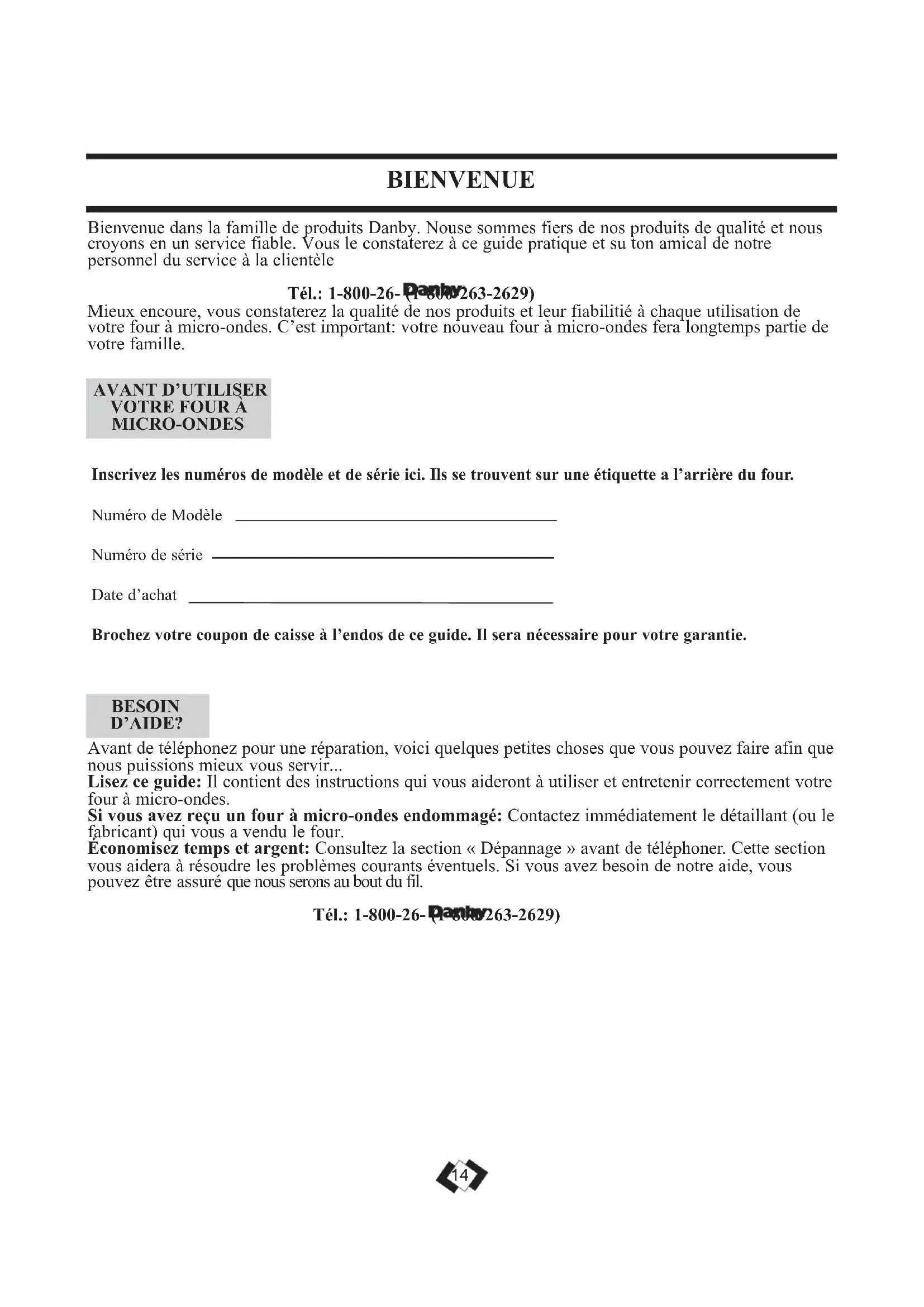 abrasive soaps or detergents applied with a sponge or soft cloth. 12Inscrivez les numéros de modèle et de série ici. Ils se trouvent sur une étiquette a l’arrière du four. Numéro de Modèle Numéro de série Date d’achat Brochez votre coupon de caisse à l’endos de ce guide. Il sera nécessaire pour votre garantie. BIENVENUE Bienvenue dans la famille de produits Danby. Nouse sommes fiers de nos produits de qualité et nous croyons en un service fiable. Vous le constaterez à ce guide pratique et su ton amical de notre personnel du service à la clientèle Tél.: 1-800-26- (1-800-263-2629) Mieux encoure, vous constaterez la qualité de nos produits et leur fiabilitié à chaque utilisation de votre four à micro-ondes. C’est important: votre nouveau four à micro-ondes fera longtemps partie de votre famille.