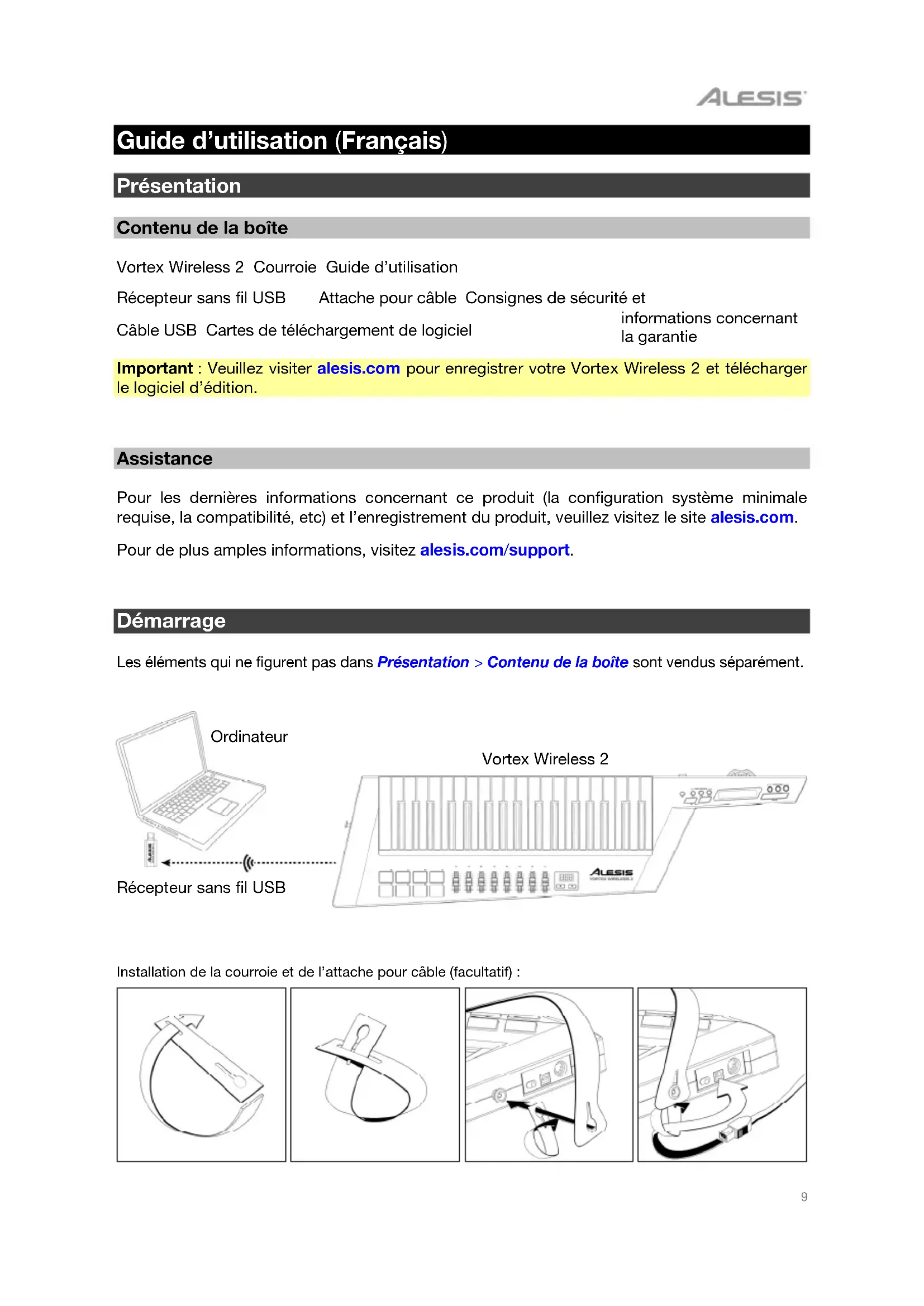 ttache pour câble Consignes de sécurité et informations concernant la garantie Câble USB Cartes de téléchargement de logiciel Important : Veuillez visiter alesis.com pour enregistrer votre Vortex Wireless 2 et télécharger le logiciel d’édition.