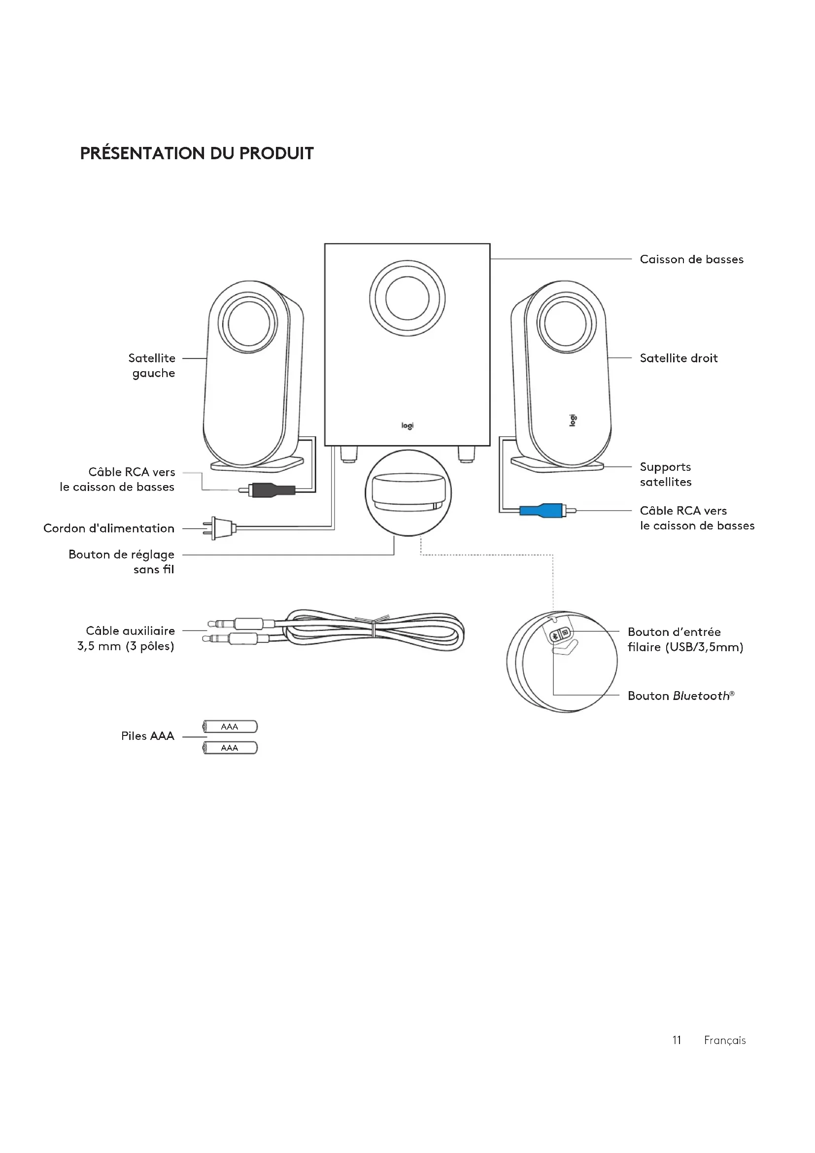 et sur le bouton d'entrée laire en même temps pendant 8 secondes pour réinitialiser le système. Le témoin lumineux commencera à clignoter rapidement deux fois, puis vous entendrez unsignal sonore de réinitialisation. Le témoin lumineux devient bleu en continu lorsque vous avez réinitialisé le système de haut-parleurs. Réinitialisation dusignal sonore 17 Français| © 2020 Logitech, Logi et le logo Logitech sont des marques commerciales ou déposées de Logitech Europe S.A. et/ou de sessociétés aliées aux États-Unis et dans d'autres pays. La marque et les logos Bluetooth