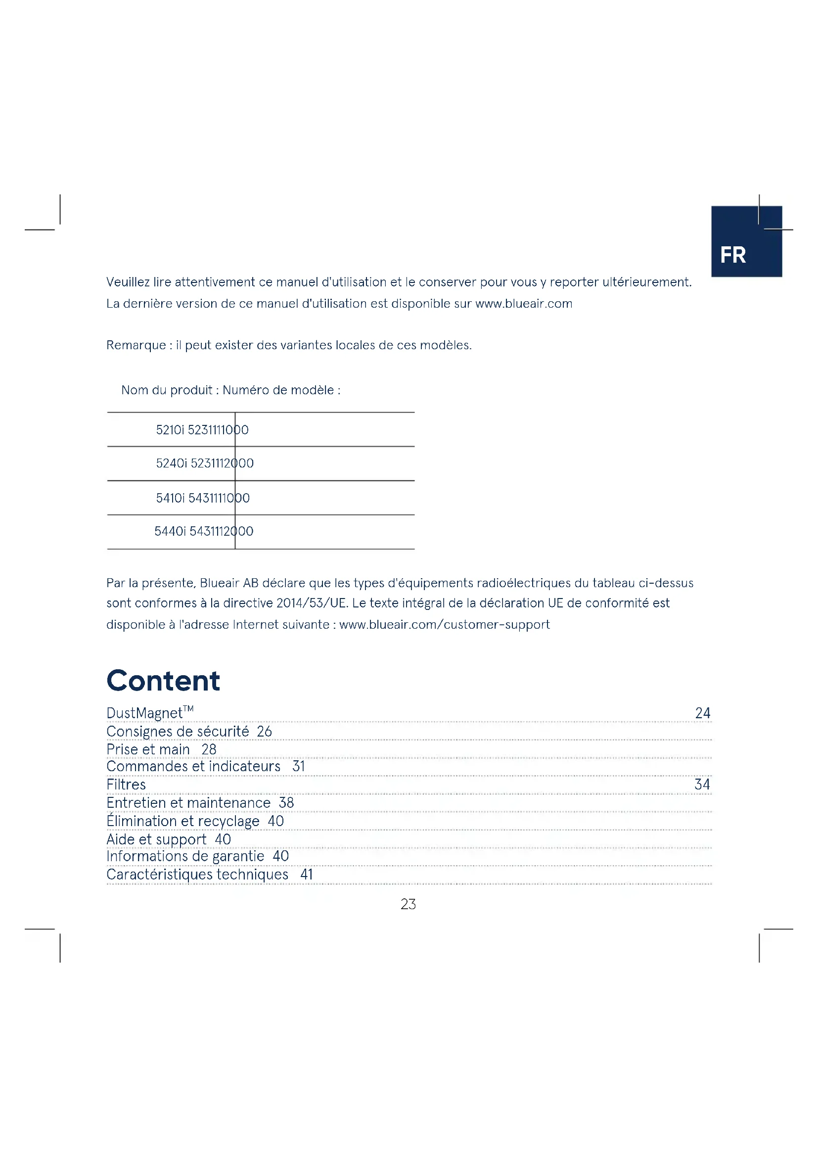 Par la présente, Blueair AB déclare que les types d'équipements radioélectriques du tableau ci-dessus sont conformes à la directive 2014/53/UE. Le texte intégral de la déclaration UE de conformité est disponible à l'adresse Internet suivante: www.blueair.com/customer-support DustMagnet 24 Consignes de sécurité 26 Prise et main 28 Commandes et indicateurs 31 Filtres 34 Entretien et maintenance 38 Élimination et recyclage 40 Aide et support 40 Informations de garantie 40 Caractéristiques techniques 41 Content Veuillez lire attentivement ce manuel d'utilisation et le conserver pour vous y reporter ultérieurement. La dernière version de ce manuel d'utilisation est disponible sur www.blueair.com Remarque: il peut exister des variantes locales de ces modèles. Nom du produit: Numéro de modèle : 5210i 5231111000 5240i 5231112000 5410i 5431111000 5440i 5431112000 FR24 Blueair DustMagnet