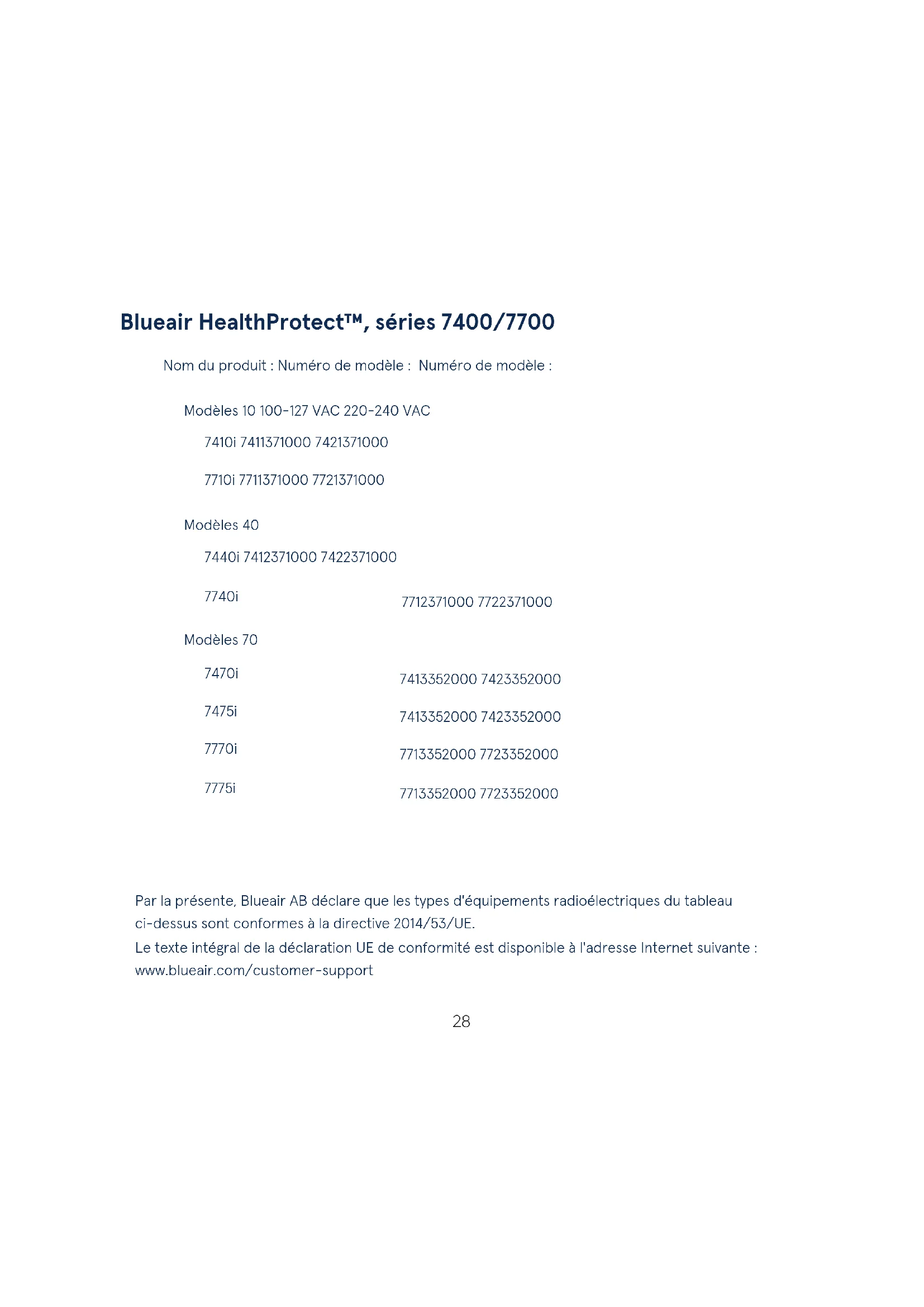 According to ANSI/AHAM AC-1-201928 Par la présente, Blueair AB déclare que les types d'équipements radioélectriques du tableau ci-dessus sont conformes à la directive 2014/53/UE. Le texte intégral de la déclaration UE de conformité est disponible à l'adresse Internet suivante: www.blueair.com/customer-support Blueair HealthProtect™, séries 7400/7700 Nom du produit: Numéro de modèle: Numéro de modèle: Modèles10 100-127VAC 220-240VAC 7410i 7411371000 7421371000 7710i 7711371000 7721371000 Modèles40 7440i 7412371000 7422371000 7740i