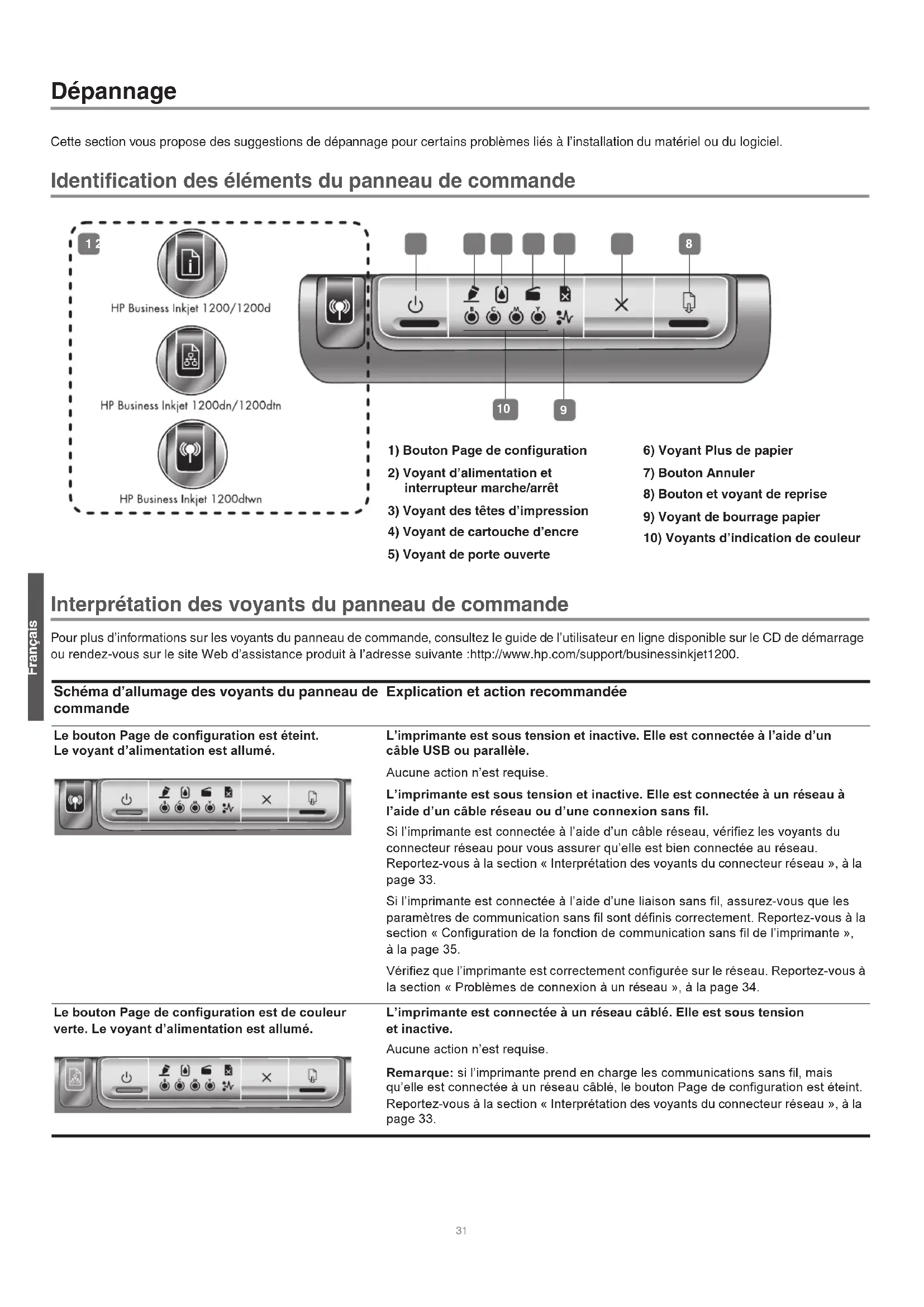 paramètres et fermer les boîtes de dialogue. Le voyant de liaison est allumé. Le voyant d’activité clignote. L’imprimante reçoit ou transmet des données sur le réseau. Aucune action n’est requise. Le voyant de liaison est éteint. Le voyant d’activité est éteint. L’imprimante est éteinte ou n’est pas connectée au réseau. Si l’imprimante est éteinte, mettez-la sous tension. Si l’imprimante est sous tension et qu’un câble réseau est connecté, reportez-vous à la section « Problèmes de connexion à un réseau », à la page 34. HPCrickMLK_GSG_UGFDIA.book Page 34 Wednesday, May 19, 2004 4:26 PM35 Français Problèmes de connexion à un réseau câblé Si le voyant de liaison du connecteur réseau ne s’allume pas, assurez-vous que toutes les conditions exposées dans la section « Dépannage des problèmes réseau » ci-dessus sont réunies. Bien qu’il soit déconseillé d’attribuer une adresse IP statique à l’imprimante, cette opération peut vous permettre de résoudre certains problèmes d’installation (un conflit avec un pare-feu personnel, par exemple). Pour plus d’informations à ce sujet, reportez-vous au guide de l’utilisateur en ligne. Problèmes de configuration de la fonction de communication sans fil S’il s’avère impossible de communiquer avec l’imprimante après avoir installé le logiciel et retiré le câble réseau, il se peut que l’un ou plusieurs des paramètres réseau suivants soient incorrects : Nom réseau (SSID) Mode de communication Canal (réseaux ad hoc uniquement) Paramètres de sécurité et clé de chiffrement Pour plus d’informations sur la correction de ces paramètres, reportez-vous à la section « Configuration de la fonction de communication sans fil de l’imprimante », à la page 35. Réinitialisation des paramètres réseau de l’imprimante Si l’imprimante ne parvient pas à communiquer avec le réseau, réinitialisez les paramètres réseau : 1 Tout en maintenant le bouton Page de configuration enfoncé, appuyez à trois reprises sur (bouton de reprise). 2 Si vous avez déjà installé le pilote d’imprimante, désinstallez-le, puis réinstallez-le. Remarque : pour obtenir des informations de dernière minute, consultez le fichier Lisezmoi et les notes de version ou rendez-vous sur le site Web d’assistance produit à l’adresse suivante : http://www.hp.com/support/businessinkjet1200. Outils de dépannage et de configuration Les outils suivants sont disponibles pour dépanner ou configurer l’imprimante. Pour plus d’informations sur ces outils, reportez-vous au guide de l’utilisateur en ligne disponible sur le CD de démarrage. Page de configuration La page de configuration vous permet de consulter les paramètres actuels de l’imprimante, de résoudre les problèmes affectant le périphérique et de vérifier l’installation des accessoires en option, tels que des bacs. Elle contient également un journal des événements récents. Si l’imprimante est connectée à un réseau, une page de configuration supplémentaire est imprimée. Cette page affiche les paramètres réseau de l’imprimante. Si vous devez appeler HP, imprimez au préalable la page de configuration. Pour imprimer une page de configuration Appuyez sur le bouton Page de configuration. Serveur Web intégré Si l’imprimante est connectée à un réseau, vous pouvez utiliser son serveur Web intégré pour consulter des informations d’état, modifier des paramètres et la gérer à partir de votre ordinateur. Pour ouvrir le serveur Web intégré Entrez l’adresse IP affectée à l’imprimante dans le champ d’adresse d’un navigateur Web pris en charge sur votre ordinateur. Par exemple, si l’adresse IP est 123.123.123.123, entrez l’adresse suivante dans le navigateur Web : http://123.123.123.123. L’adresse IP de l’imprimante figure sur la page de configuration. Après avoir ouvert le serveur Web intégré, vous pouvez lui affecter un signet en vue d’y accéder rapidement à l’avenir. Configuration de la fonction de communication sans fil de l’imprimante L’imprimante est conçue pour les réseaux sans fil 802.11g et offre une compatibilité avec les réseaux 802.11b. Remarque : pour que les communications sans fil fonctionnent, les paramètres suivants doivent être identiques sur l’ordinateur et sur le périphérique. Configuration des paramètres de base de la communication sans fil Pour installer l’imprimante sur un réseau sans fil, vous devez connaître le mode de communication du réseau, ainsi que son nom réseau (SSID). Reportez-vous à l’utilitaire de configuration de la carte réseau de votre ordinateur ou du point d’accès sans fil (WAP) du réseau. Mode de communication Deux options sont possibles pour le mode de communication d’un réseau. Infrastructure (recommandé) Lorsque l’imprimante est définie en mode d’infrastructure, elle communique avec d’autres périphériques du réseau, qu’ils soient câblés ou sans fil, par le biais d’un point d’accès sans fil (WAP). Ces points d’accès font généralement office de routeurs ou de passerelles sur les petits réseaux. Ad hoc (utilisateurs expérimentés uniquement) Lorsque l’imprimante est définie en mode de communication ad hoc, elle communique directement avec d’autres périphériques sans fil, sans passer par un point d’accès sans fil (WAP). Pour plus d’informations sur l’installation de l’imprimante sur un réseau ad hoc existant, rendez-vous sur le site Web de HP à l’adresse suivante : http://www.hp.com/support. Nom réseau (SSID) Un nom réseau, ou SSID (Service Set Identifier), identifie un réseau sans fil spécifique. Pour pouvoir fonctionner sur un réseau, un périphérique doit obligatoirement connaître ce nom. HPCrickMLK_GSG_UGFDIA.book Page 35 Wednesday, May 19, 2004 4:26 PM36 Configuration des paramètres de sécurité du réseau sans fil Types de sécurité sans fil Vous po