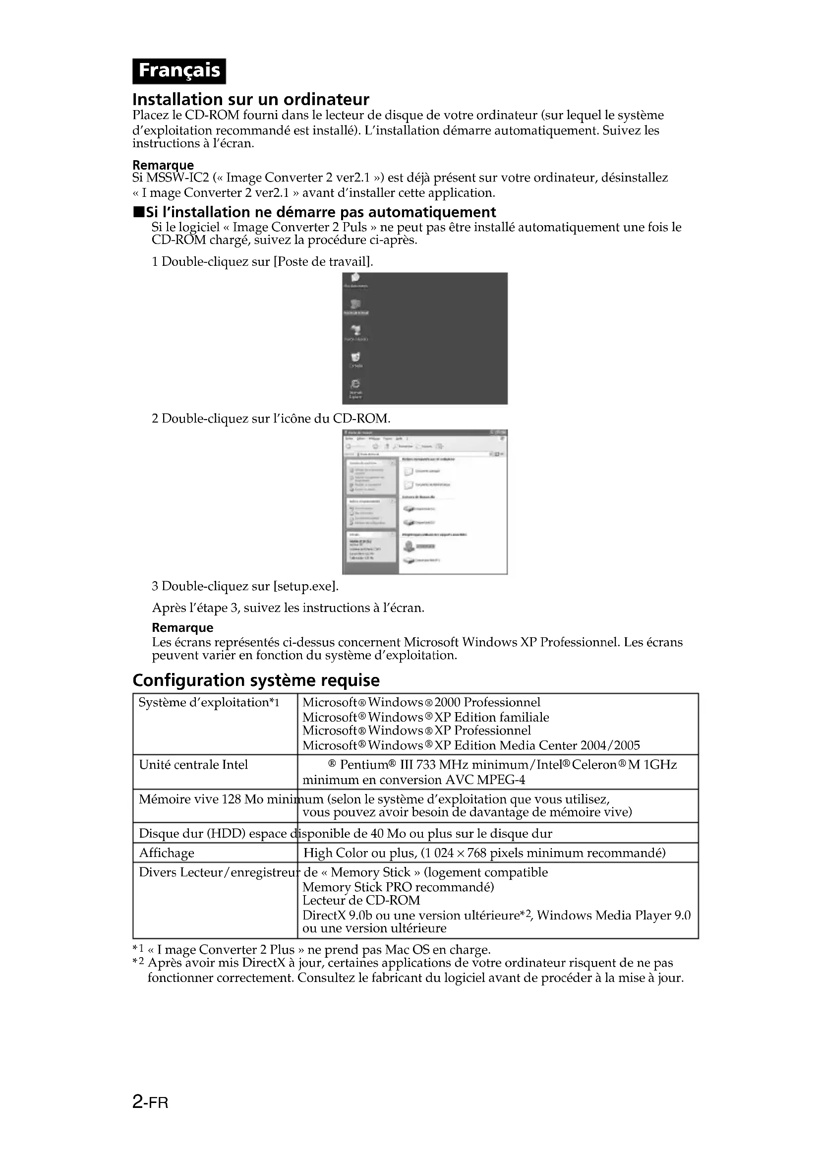 ” marks are not specified in this manual.2-FR Français Installation sur un ordinateur Placez le CD-ROM fourni dans le lecteur de disque de votre ordinateur (sur lequel le système d’exploitation recommandé est installé). L’installation démarre automatiquement. Suivez les instructions à l’écran. Remarque Si MSSW-IC2 (« Image Converter 2 ver2.1 ») est déjà présent sur votre ordinateur, désinstallez «Image Converter 2 ver2.1 » avant d’installer cette application. x Si l’installation ne démarre pas automatiquement Si le logiciel « Image Converter 2 Puls » ne peut pas être installé automatiquement une fois le CD-ROM chargé, suivez la procédure ci-après. 1 Double-cliquez sur [Poste de travail]. 2 Double-cliquez sur l’icône du CD-ROM. 3 Double-cliquez sur [setup.exe]. Après l’étape 3, suivez les instructions à l’écran. Remarque Les écrans représentés ci-dessus concernent Microsoft Windows XP Professionnel. Les écrans peuvent varier en fonction du système d’exploitation. Configuration système requise Système d’exploitation*