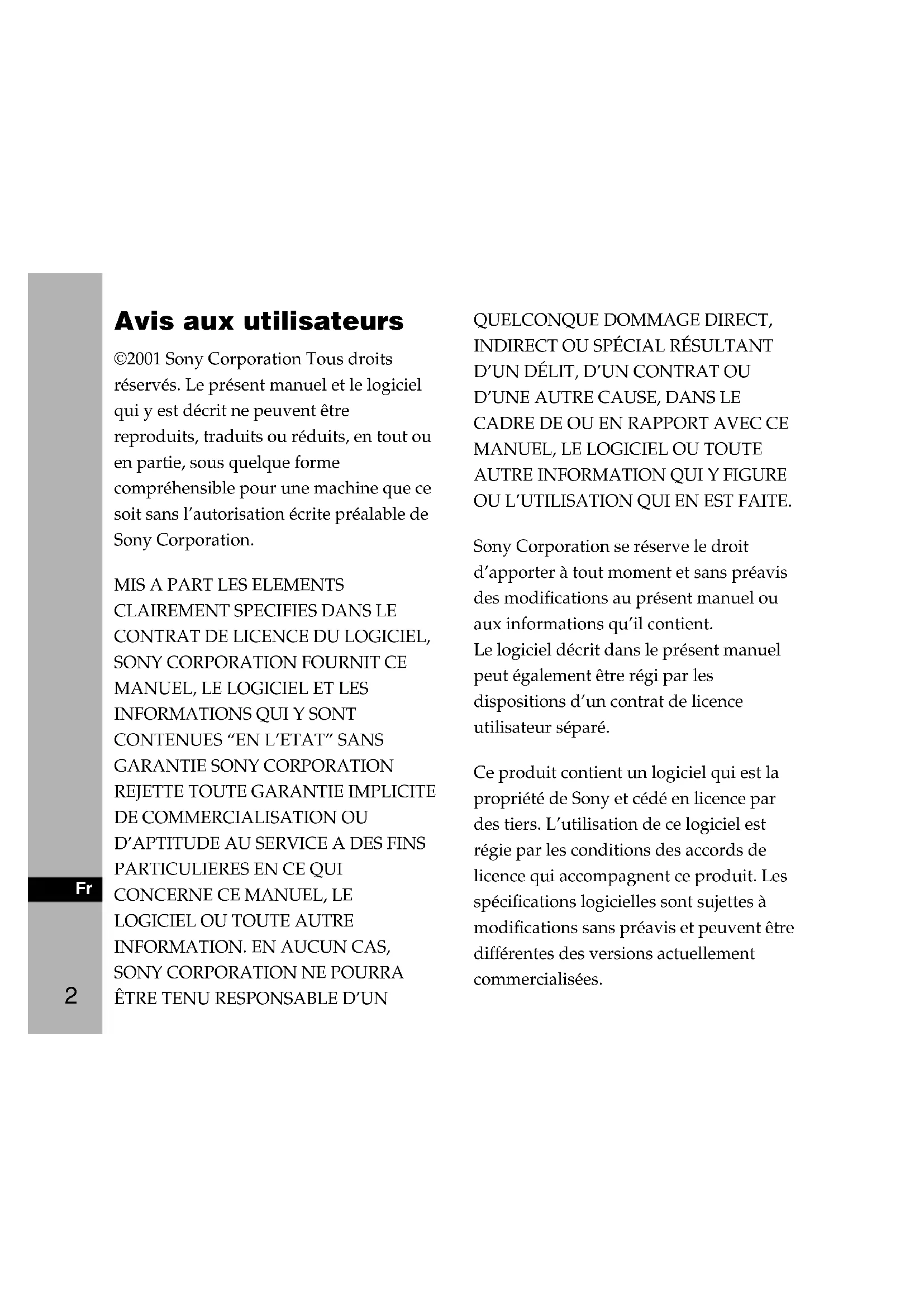 Avis aux utilisateurs ©2001 Sony Corporation Tous droits réservés. Le présent manuel et le logiciel qui y est décrit ne peuvent être reproduits, traduits ou réduits, en tout ou en partie, sous quelque forme compréhensible pour une machine que ce soit sans l’autorisation écrite préalable de Sony Corporation.