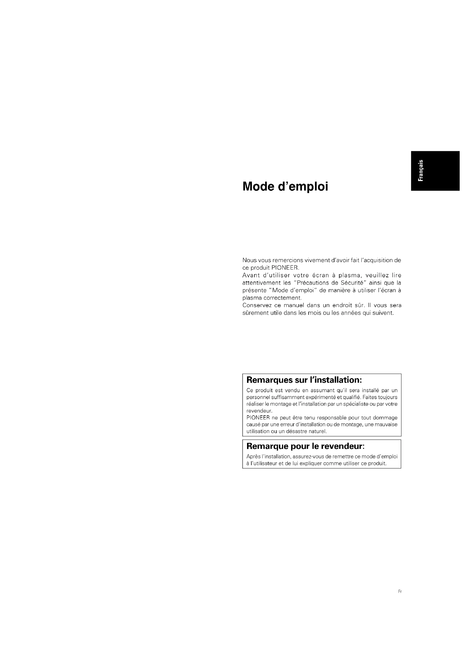 Précautions de Sécurité Français Mode d’emploi Nous vous remercions vivement d’avoir fait l’acquisition de ce produit PIONEER. Avant d’utiliser votre écran à plasma, veuillez lire attentivement les “Précautions de Sécurité” ainsi que la présente “Mode d’emploi” de manière à utiliser l’écran à plasma correctement. Conservez ce manuel dans un endroit sûr. Il vous sera sûrement utile dans les mois ou les années qui suivent. Remarques sur l’installation: Ce produit est vendu en assumant qu’il sera installé par un personnel suffisamment expérimenté et qualifié. Faites toujours réaliser le montage et l’installation par un spécialiste ou par votre revendeur. PIONEER ne peut être tenu responsable pour tout dommage causé par une erreur d’installation ou de montage, une mauvaise utilisation ou un désastre naturel. Remarque pour le revendeur: Après l’installation, assurez-vous de remettre ce mode d’emploi à l’utilisateur et de lui expliquer comme utiliser ce produit.ii