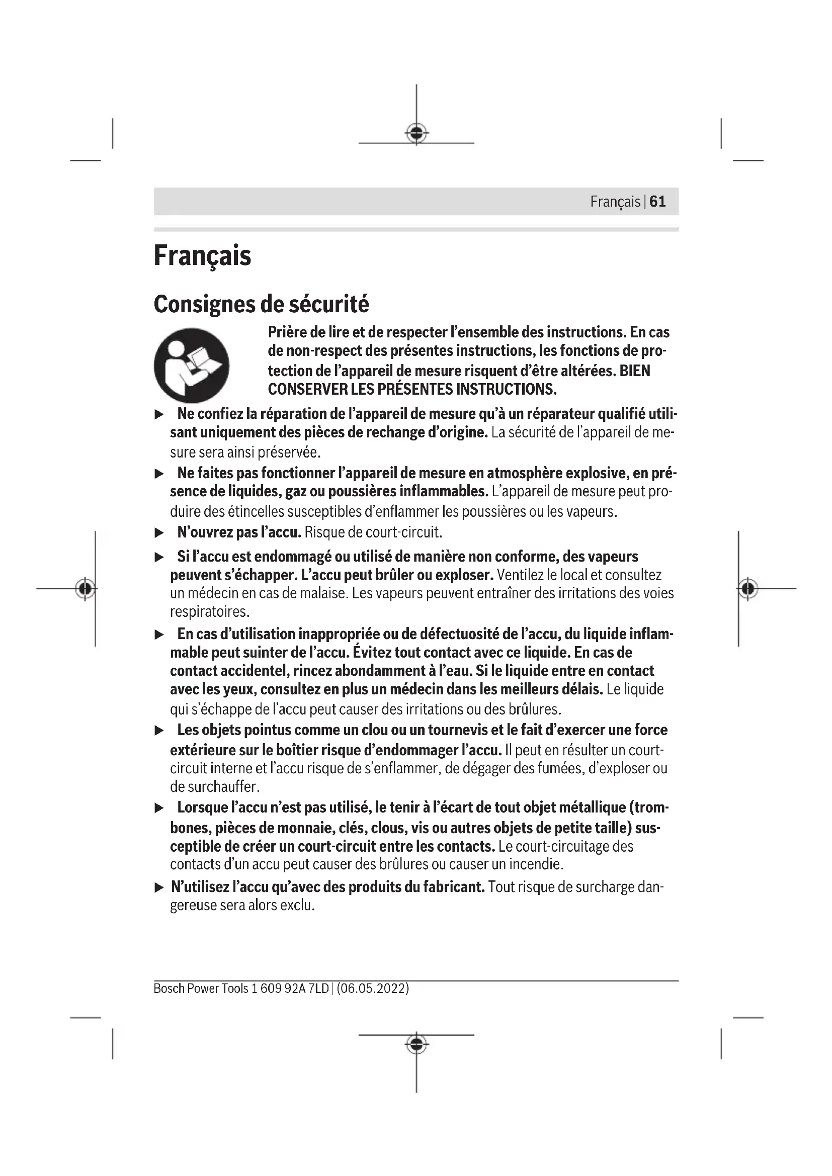 IP 5X Températures ambiantes recommandées pour la charge 0°C…+35°C Températures ambiantes autorisées pour l’utilisation –10°C…+50°C Températures ambiantes autorisées pour le stockage –20°C…+70°C Accus recommandés GBA 10,8V 2.0Ah GBA 10,8V 3.0Ah GBA 12V 2.0Ah GBA 12V 3.0Ah 1 609 92A 7LD | (06.05.2022) Bosch Power ToolsFrançais | 67 Détecteur universel D-tect 200 C Chargeurs recommandés GAL 12… GAX 18… A) Dépend du matériau, de la taille des objets, de l’état du support et de la vue sélectionnée. Les meilleurs résultats sont obtenus dans des supports homogènes et secs. Il convient en plus de prendre en compte une imprécision ±0,5mm/cm sur la profondeur affichée pour les objets en- fouis de plus de 60mm. B) selon le type de matériau et l’état du support C) N’est conçu que pour les salissures/saletés non conductrices mais supporte occasionnellement la conductivité due aux phénomènes de condensation. D) Dépend de l’accu utilisé E) L’accu Lithium-Ion et l’adaptateur piles AA1 sont exclus de la protection IP5X. Pour une identification précise de votre appareil de mesure, basez-vous sur le numéro de série (20) inscrit sur la plaque signalétique. u Dans les cas défavorables, la précision de mesure peut être moins bonne et la profondeur maximale de détection plus faible que ce qui est indiqué. Pour le test récepteur qui évalue l’influence d’un signal parasite sur l’appareil de mesure, il a été utilisé le critère et le niveau de performance définis dans la spécification ETSI TS103361 (V1.1.1) chapitre 9.4.1 avec une profondeur d’objet d=60mm. Utilisation u Protégez l’appareil de mesure contre l’humidité, ne l’exposez pas directement aux rayons du soleil. u N’exposez pas l’appareil de mesure à des températures extrêmes ou de brusques variations de température. S’il est exposé à d’importants variations de tempéra- ture, laissez-le revenir à la température ambiante avant de le remettre en marche. Des températures ou variations de température extrêmes peuvent altérer la précision de l’appareil de mesure et de l’affichage. u Évitez les chocs ou les chutes de l’appareil de mesure. Après avoir exposé l’appa- reil de mesure à des conditions extérieures extrêmes ou en cas de détection d’un fonctionnement anormal de sa part, faites-le contrôler dans un point de service après- vente Bosch agréé. u La précision de mesure peut être altérée par certaines conditions environnantes. Les sources de perturbation possibles sont par ex. les appareils produisant des champs électriques, magnétiques ou électromagnétiques intenses qui se trouvent à proximité, l’humidité, les matériaux de construction métalliques, les matériaux isolants à feuille d’aluminium ou les papiers peints et carrelages Bosch Power Tools 1 609 92A 7LD | (06.05.2022)68 | Français conducteurs. Avant de percer, scier ou réaliser des saignées dans des murs, plafonds ou sols, consultez toutes sources d’information disponibles (par ex. les plans de construction). u Pour ne pas fausser les mesures, tenez l’appareil de mesure au niveau des sur- faces de préhension (11) prévues. u N’apposez pas d’autocollants ou étiquettes dans la zone de détection (19) au dos de l’appareil de mesure. Les étiquettes métalliques risquent notamment de fausser les résultats de mesure. Ne portez pas de gants pendant la mesure et veillez à une mise à la terre suffisante. Dans le cas d’une mise à la terre insuffisante, la détection de câbles électriques sous tension risque d’être altérée. Évitez pendant la mesure la proximité d’appareils qui génèrent de forts champs électriques, magnétiques ou électromagnétiques. Dans la mesure du possible, désactivez sur ces appareils les fonctions dont le rayonnement peut perturber la mesure ou bien éteignez totale- ment les appareils. Alimentation en énergie de l’appareil de mesure L’appareil de mesure est conçu pour fonctionner avec des piles du commerce ou un accu Lithium-ion Bosch. Fonctionnement avec accu Lithium-Ion (voirfigureA) u N’utilisez que les chargeurs indiqués dans les Caractéristiques techniques. Ces chargeurs sont les seuls à être adaptés à l’accu Lithium-Ion de votre appareil de me- sure. Remarque : L’utilisation d’accus non conçus pour votre appareil de mesure peut entraî- ner des dysfonctionnements ou endommager l’appareil de mesure. Remarque : L’accu est fourni partiellement chargé. Pour obtenir les performances maxi- males, chargez l’accu jusqu’à sa pleine capacité avant la première utilisation. L’accu Lithium-ion peut être rechargé à tout moment, sans risquer de réduire sa durée de vie. Le fait d’interrompre le processus de charge n’endommage pas l’accu. L’accu Lithium-Ion est protégé contre les décharges complètes par l’électronique de pro- tection des cellules "Electronic Cell Protection (ECP)". Quand l’accu est déchargé, un circuit de protection désactive automatiquement l’appareil de mesure. Pour mettre en place l’accu(10) chargé, insérez-le dans le logement d’accu(25) jus- qu’à ce qu’il s’enclenche de manière audible. 1 609 92A 7LD | (06.05.2022) Bosch Power ToolsFrançais | 69 Pour extraire l’accu(10), pressez les pattes de déverrouillage(9) de l’accu et sortez l’accu du logement(25). Ne forcez pas. Fonctionnement avec piles (voirfigureB) Il est recommandé d’utiliser des piles alcalines au manganèse. Les piles doivent être insérées dans l’adaptateur de piles. u L’adaptateur de piles est uniquement destiné à une utilisation sur les appareils de mesure Bosch conçus à cet effet. Il n’est pas conçu pour être utilisé avec des outils électroportatifs. Pour insérer les piles, insérez le corps(28) de l’adaptateur piles dans le logement d’accu(25). Insérez les piles dans le corps comme représenté sur l’illustratio