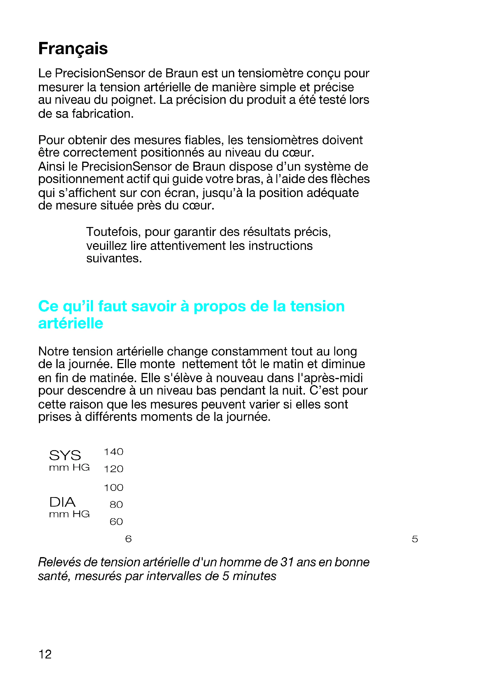 Appuyez sur le bouton de sélection pendant quelques secondes. 1 / min mmHg mmHg SYS DIA Puls beep 6057008_BP2008_S4-52 Seite 16 Mittwoch, 19. April 2000 1:58 1317 Mise à l'arrêt de l’appareil Appuyez sur le bouton I/0 pour éteindre le tensio- mètre. Si vous ne le faites pas, l’appareil s’éteindra automatiquement après de 2 minutes. Entretien et nettoyage Nettoyer le boîtier de l’appareil avec un chiffon doux et humide. Les taches faites sur le manchon (G) peuvent être retirées avec précaution à l'aide d'un chiffon humide. Ne pas nettoyer le manchon, que ce soit à l'eau ou à sec. Ne pas stocker l’appareil en plein soleil ou dans des conditions d’humidité extrêmes. Calibrage Ce produit a fait l’objet d’un calibrage au moment de sa fabrication. S'il est utilisé conformément aux instructions, il ne sera pas nécessaire de procéder à un recalibrage périodique. Si vous doutez de la précision de la lecture, à quelque moment que ce soit, veuillez contacter le Service Après-Vente Braun. La date de fabrication est indiquée par un numéro de LOT situé au dos du produit. Le premier numéro après LOT correspond au dernier chiffre de l'année de fabrication. Les trois numéros suivants indiquent le jour de l'année de fabrication. Par exemple : LOT 0116 xx xx – ce produit a été fabriqué au cours du 116 ème jour de l'an 2000. 6057008_BP2008_S4-52 Seite 17 Mittwoch, 19. April 2000 1:58 1318 Que faire en cas de problème Si un message d'erreur affiche un chiffre inférieur à 64, ou si n'importe quelle autre erreur persiste, faites vérifier le produit par le Service Après-Vente Braun. Si vous vous posez d'autres questions, appelez la ligne téléphonique d’information Braun. Problème Situation Solution Les piles sont faibles. Les mesures sont encore possibles. Remplacer rapidement les piles. Les piles sont déchargées. Toute prise de mesure est impossible. Remplacer les piles. Message d'erreur indiquant un chiffre égal ou supérieur à 64. Bien resserrer le manchon, puis prendre une nouvelle mesure. 6057008_BP2008_S4-52 Seite 18 Mittwoch, 19. April 2000 1:58 1319 Spécifications du produit Modèle : BP 2008 Principe de fonctionnement : Méthode oscillométrique Indicateur : Affichage à Cristaux Liquides Plage de mesure : 0 – 300 mm Hg (pression de manchon) 40 – 160 / min (fréquence du pouls) Plage de mesure de la tension artérielle : 50 mm Hg (valeur diastolique minimale) 250 mm Hg (valeur systolique maximale) Précision : ±3 mm Hg (pression de manchon) ±5 % (fréquence du pouls) Gonflage : Automatique Dégonflage : Soupape de réglage électronique Alimentation : 2 piles alkaline de type LR 03 (AAA) (type Duracell-Ultra) Température de fonctionnement : + 10 °C – + 40 °C Température de stockage : – 20 °C – + 60 °C Humidité : 85 % HR ou moins Manchon : Tour de poignet de 13,5 à 20 cm Équipement type BF Les spécifications sont susceptibles d'être modifiées sans préavis. Ce produit est conforme aux dispositions de la directive CE 93/42/CEE (Directive sur les Dispositifs Médicaux). 6057008_BP2008_S4-52 Seite 19 Mittwoch, 19. April 2000 1:58 1320 Español Braun PrecisionSensor es un monitor de la presión arterial que ha sido desarrollado para medir de forma sencilla y precisa la presión arterial en la muñeca. La precisión del producto ha sido probada a lo largo de todo el proceso de fabricación. Los monitores para la presión arterial han de situarse siempre de forma apropiada, a la altura del corazón, para obtener medidas fiables. Braun PrecisionSensor tiene un sistema de posicionamiento activo que guía su brazo mediante un puntero en su pantalla, para obtener la posición apropiada para realizar la monitorización cerca del corazón. De todas maneras, para asegurarse resultados precisos, lea cuidadosamente las siguientes instrucciones. Qué debe saber sobre la presión arterial La presión arterial cambia constantemente a lo largo del día. Se muestra muy alta a primera hora de la mañana y decae al final de la misma. La presión arterial vuelve a elevarse por la tarde y finalmente cae al nivel más bajo por la noche. Esto explica las lecturas pueden fluctuar cuando se realizan las mediciones en diferentes momentos del día. La monitorización de la presión arterial de un hombre sano de 31 años debe ser hecha a intervalos de 5 minutos SYS mm HG