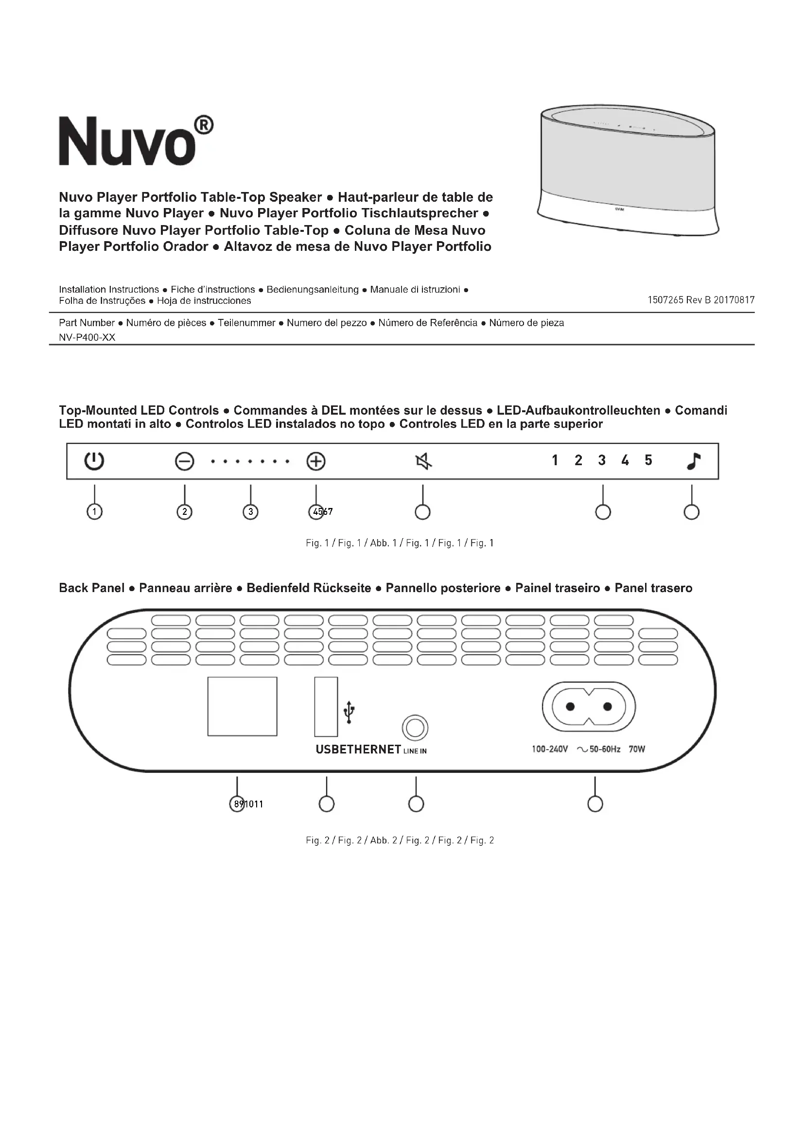 Player [NV-P400-XX]. Ce système polyvalent et autonome P400 correspond à une zone du système de la gamme Nuvo Player ou à un complément des 16 zones possibles du système, permettant l’accès au contenu audio en réseau et à une variété de services de diffusion en continu. Le P400 possède une connexion Ethernet et sans l (802.11 a/b/g/n, 2,4 GHz ou 5 GHz) compatible. Ce puissant système 2.1 offre une excellente qualité avec son caisson de basses intégré de 5 1/4 po (13,34 cm), ses deux médiums et ses deux tweeters. Avec des options exibles de commande, accéder à la musique que vous aimez n’a jamais été aussi simple grâce à la technologie tactile capacitive, aux boutons à DEL rétroéclairés, à l’un des claviers muraux Nuvo Player ou aux applications pratiques Nuvo Player pour iOS et Android. Le P400 est un système épuré qui fournit un son pur et cristallin dans toutes les pièces de votre maison. INSTALLATION (Fig. 3) ÉTAPE 1 : Brancher le câble Ethernet dans le port Ethernet à l’arrière du P400. Un câble Ethernet DOIT être utilisé pour la conguration initiale du P400. Pendant la conguration, vous avez la possibilité d’utiliser le P400 avec un réseau Wi-Fi à 2,4 GHz ou 5 GHz. ÉTAPE 2 : Si une clé USB est utilisée avec le P400, l’insérer à ce moment-là. (Optionnel) Remarque : Se référer au manuel de produit du système audio de la gamme Nuvo Player pour connecter le P400 au système de la gamme Player, et accéder aux services de diffusion en continu et/ou de contenu audio en réseau. ÉTAPE 3 : Brancher le câble d’entrée stéréo analogique de 3,5 mm dans la prise d’entrée stéréo analogique. (Optionnel) Remarque : Connecter un appareil mobile compatible au P400 à l’aide du câble d’entrée stéréo analogique permet à l’utilisateur d’écouter ses sélections musicales stockées sur l’appareil connecté. ÉTAPE 4 : Brancher le cordon d’alimentation dans le connecteur du cordon d’alimentation du P400 à l’arrière du haut-parleur. ÉTAPE 5 : Télécharger et lancer l’application de la gamme Nuvo Player à partir de l’App Store d’Apple ou de Google Play Marketplace. Suivre les instructions sur l’écran de l’application pour terminer la conguration du P400.