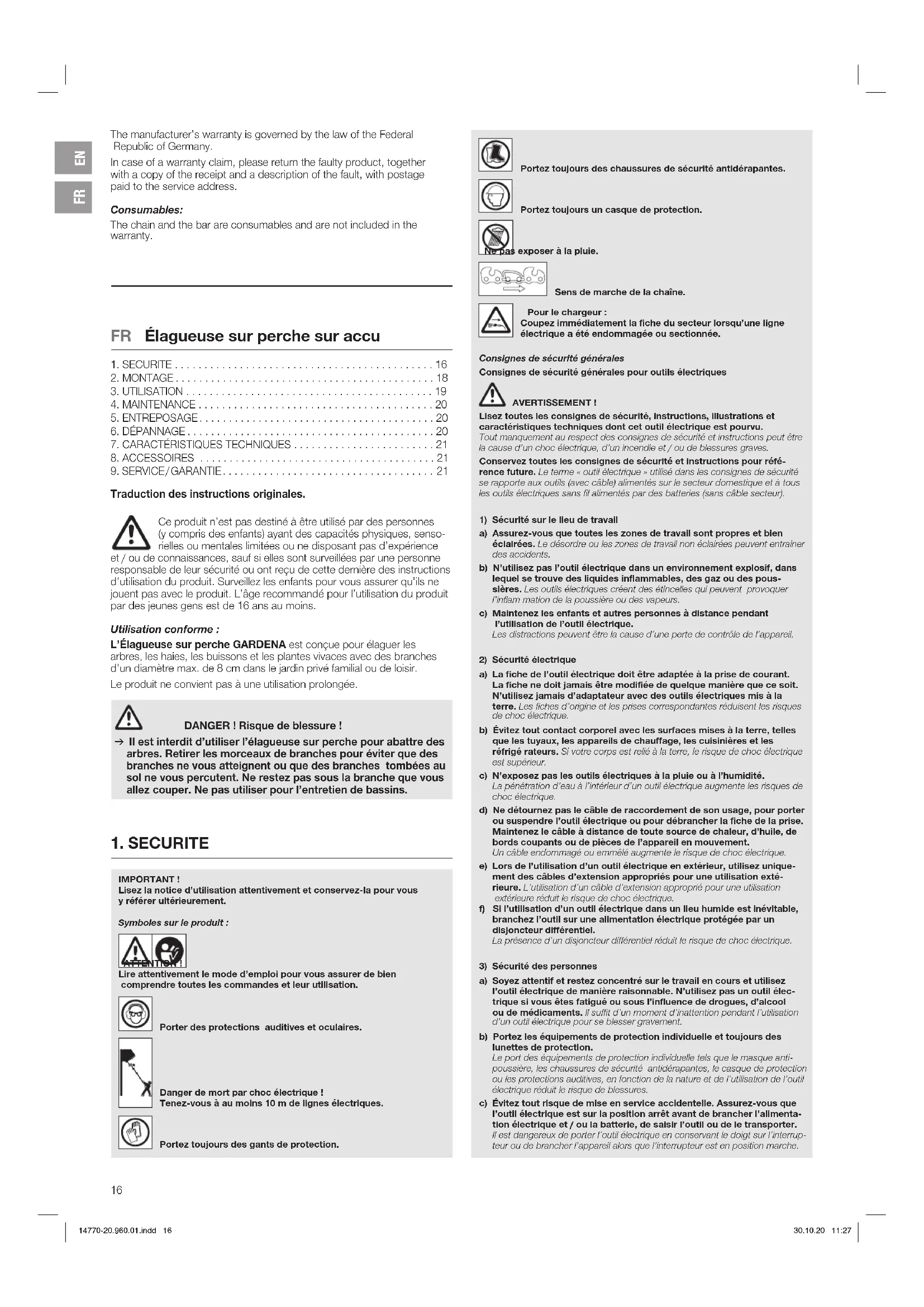 - Présentation de la preuve d’achat. L’usure normale de pièces et de composants (par exemple sur des lames, pièces de fixation des lames, turbines, éclairages, courroies trapézoïdales et crantées, turbines, filtres à air, bougies d’allumage), des modifications d’aspect ainsi que les pièces d’usure et de consommation sont exclues de la garantie. Cette garantie de fabricant est limitée à la livraison de remplacement et à la réparation en vertu des conditions mentionnées ci-avant. D’autres pré- tentions à notre encontre en tant que fabricant, par exemple dommages et intérêts, ne sont pas fondées par la garantie de fabricant. Cette garantie de fabricant ne concerne bien évidemment pas les réclamations de garan- tie existantes, légales et contractuelles envers le revendeur / l’acheteur. La garantie de fabricant est soumise au droit de la République Fédérale d’Allemagne. En cas de recours à la garantie, veuillez renvoyer le produit défectueux accompagné d’une copie de la preuve d’achat et d’une description du défaut, suffisamment affranchi, à l’adresse de service GARDENA. Pièces d’usure: La chaîne et la lame sont des pièces d’usure et ne sont donc pas couvertes par la garantie.