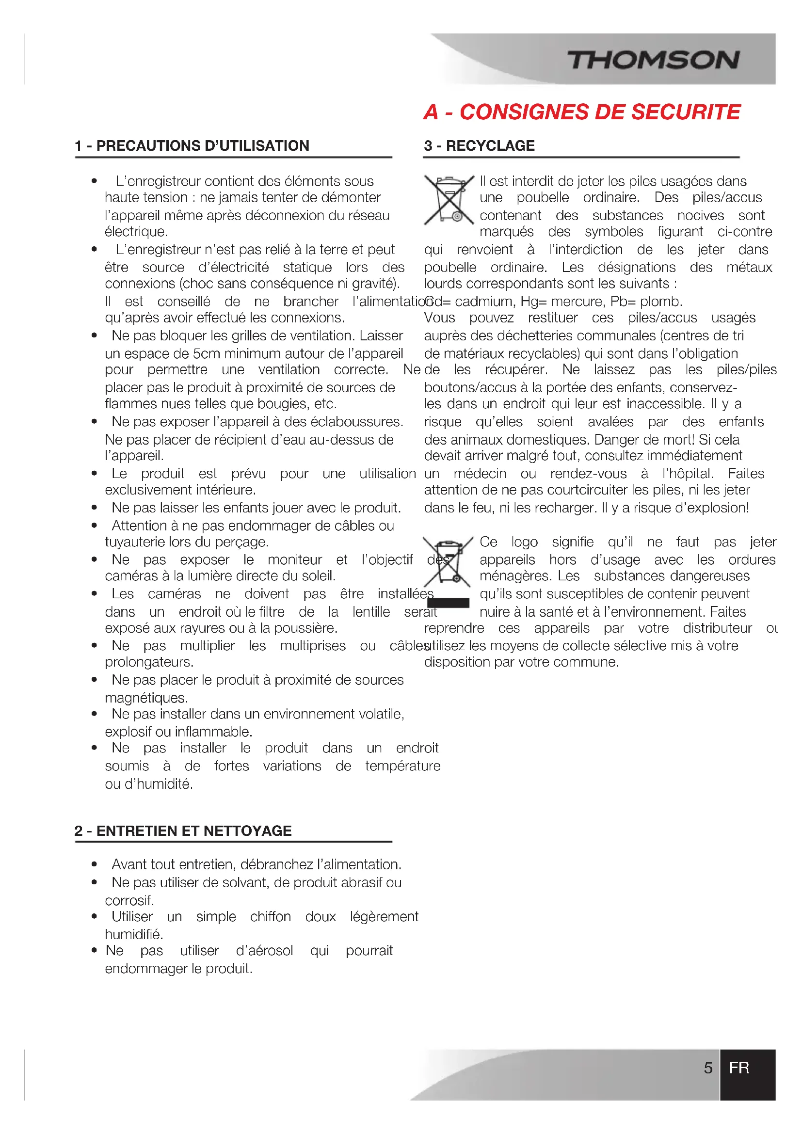 Ilestinterditdejeterlespilesusagéesdans une poubelle ordinaire. Des piles/accus contenant des substances nocives sont marqués des symboles gurant ci-contre qui renvoient à l’interdiction de les jeter dans une poubelle ordinaire. Les désignations des métaux lourdscorrespondantssontlessuivants: Cd=cadmium,Hg=mercure,Pb=plomb. Vous pouvez restituer ces piles/accus usagés auprèsdesdéchetteriescommunales(centresdetri dematériauxrecyclables)quisontdansl’obligation de les récupérer. Ne laissez pas les piles/piles boutons/accusàlaportéedesenfants,conservez- lesdansun endroitquileurest inaccessible.Ily a risque qu’elles soient avalées par des enfants ou desanimauxdomestiques.Dangerdemort!Sicela devaitarrivermalgrétout,consultezimmédiatement un médecin ou rendez-vous à l’hôpital. Faites attentiondenepascourtcircuiterlespiles,nilesjeter danslefeu,nilesrecharger.Ilyarisqued’explosion! Ce logo signie qu’il ne faut pas jeterles appareils hors d’usage avec les ordures ménagères.Les substancesdangereuses qu’ilssontsusceptiblesdecontenirpeuvent nuireàlasantéetàl’environnement.Faites reprendre ces appareils par votre distributeur ou utilisezlesmoyensdecollectesélectivemisàvotre dispositionparvotrecommune.