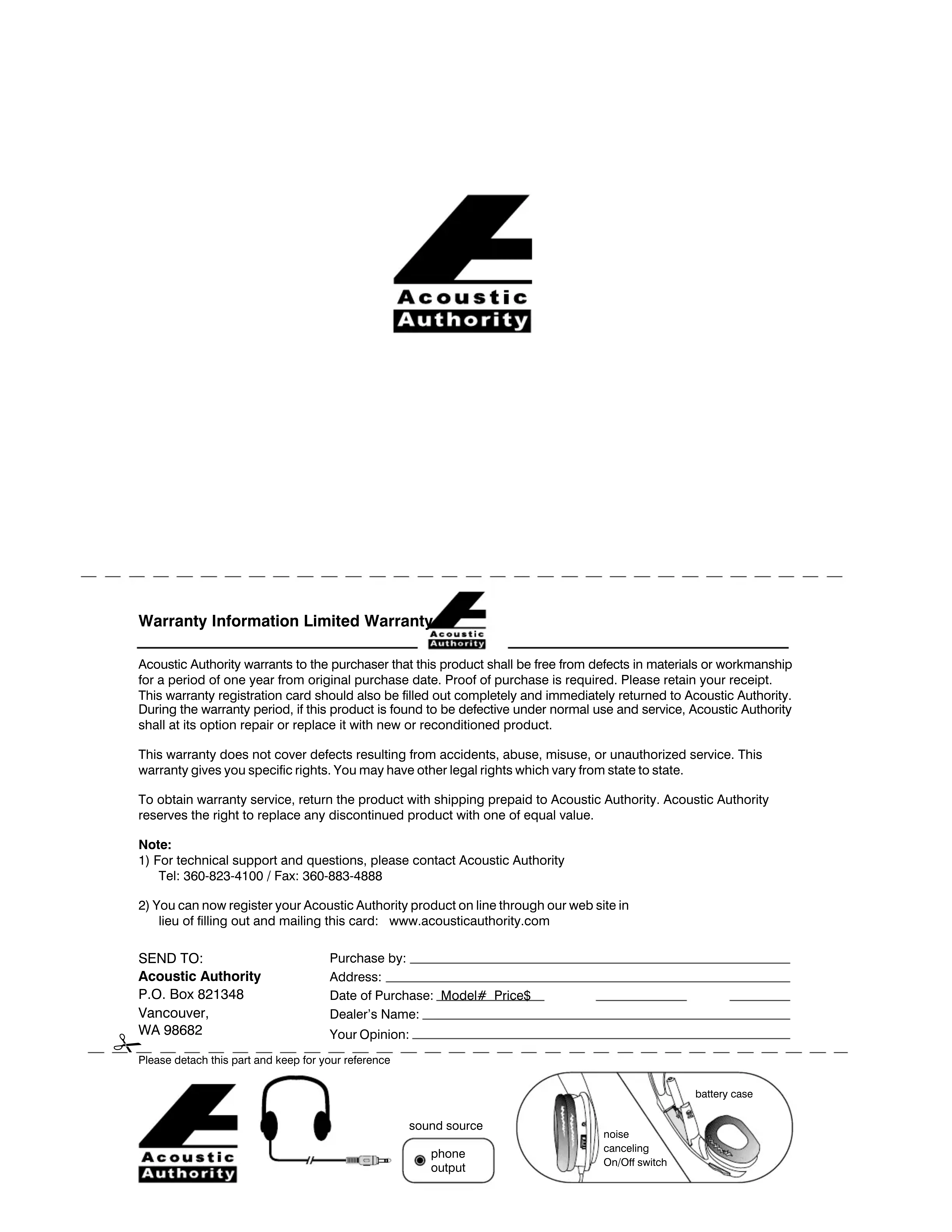 1) Pour le support et les questions techniques, adressez-vous à Acoustic Authority Tel: 360-823-4100 / Fax: 360-883-4888 2) Vous pouvez à partir enregistrer votre produit Acoustic Authority en ligne, via le site Web ou remplir cette carte et la renvoyer par la poste : www.acousticauthority.com