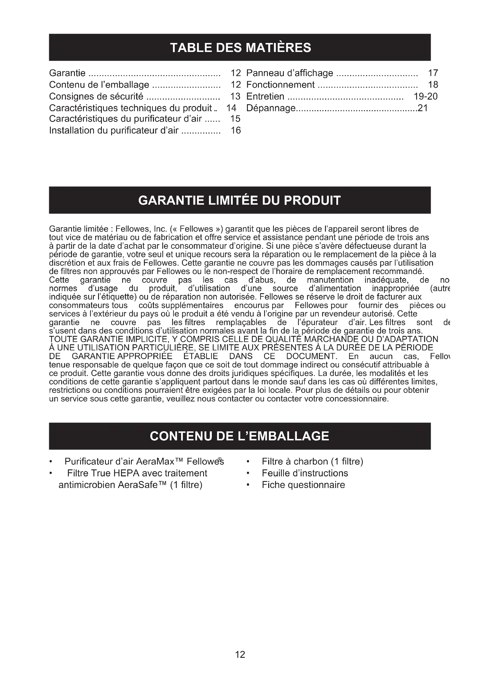 - Maintenirl’unitéausec. Remplacement des ltres Lesindicateursderemplacementdes ltresindiquentlemomentoùlesltres TrueHEPAet/ouàcharbondoiventêtre remplacés.Lapériodederemplacement varieenfonctiondesheuresd’utilisation etdelaqualitédel’air.Toutefois,dans desconditionsd’utilisationnormales,la plupartdesltresTrueHEPAdoiventêtre remplacéschaqueannée,etlesltresà charbontouslestroismois. Nenettoyezpasnineréutilisezlesltres TrueHEPAouàcharbon:celaaura unimpactsurleurefcacité.Utilisez uniquementdesltresderechange AeraMax™demarqueFellowes. Procédure de remplacement des ltres 1.Retirezletiroir. 2.Ôtezlesltresquidoiventêtre remplacés. 3.Sortezlesnouveauxltresdeleur emballage. Pourlesnumérosdepiècedesltresde rechange,consultezlapage14. 18 194.Insérezlesnouveauxltresdansl’unité principale.(Inséreztoujoursleltreàcharbon enpremierdansletiroir,puisleltreTrue HEPA.) 5.Pourréinitialiserl’indicateurdultreunefois lenouveaultreTrueHEPAet/ouàcharbon insérédansl’unité: a.Assurez-vousqueletiroirestbienfermé. b.Mettezl’unitésoustension. c. Trouvezl’icôneduremplacementdesltres surlepanneaud’afchage. d.Appuyezetmaintenezenfoncéel’icône duremplacementdesltrespendant 3secondesjusqu’àentendreunbip. L’icônedultreHEPAdecouleurambre clignotealors.Appuyezsurl’icônedultre pourbasculerentreltreHEPAetltreà charbon. e.Unefoisqueleltresouhaités’allume, appuyezetmaintenezl’icôneenfoncée pendant3à5secondes.Unbipcourt sefaitentendreetl’indicateurs’éteint. Recommencezlaprocédurepourchaque ltreaubesoin. 2120DÉPANNAGE Avant de contacter l’assistance à la clientèle Solutions aux problèmes courants Passezcettelisteenrevueavantdecontacterl’assistanceàlaclientèle.Cetteliste abordelesproblèmesquinesontpasliésauxdéfautsdematériauxoudefabrication. L’uniténeltrepas toutelafuméeou touteslesodeurs. Desmauvaises odeurssemblentse dégagerdel’unité. L’unitéémetunfaible bruitsemblableau mécanismed’une horloge. L’unitécréedes interférencesavec laréceptiondes programmestélévisés/ deradio. Les indicateurs des ltresTrueHEPAet àcharbonrestent allumésaprèsavoir remplacélesltres. L’icône PlasmaTRUE™ne s’allumepas. Lemauvaisindicateur deremplacementdes ltresaétéréinitialisé.