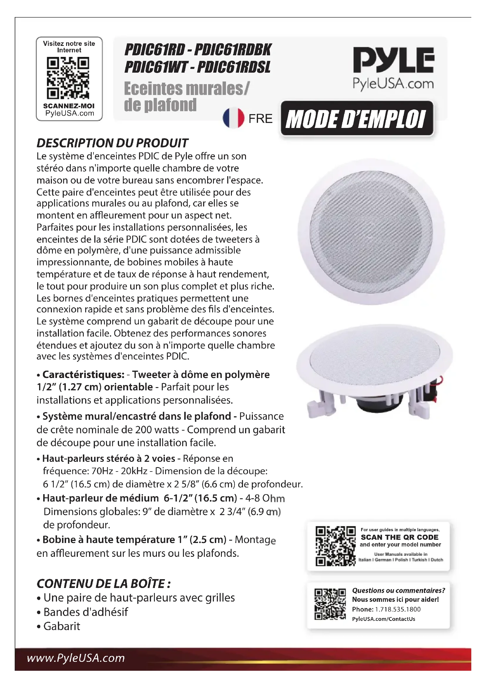 - Avec les systèmes de son surround multicanaux, il est essentiel de connecter tous les haut-parleurs avec la bonne polarité an de préserver l'ambiance et la directionnalité du programme. ENCEINTES AU PLAFOND DE LA CONSTRUCTION EXISTANTES• If using multiple pairs of main speakers, check if the impedance requirements of your receiver/amplier are met. Register Product Thank you for choosing PyleUSA. By registering your product, you ensure that you receive the full benets of our exclusive warranty and personalized customer support. Complétez le formulaire pour accéder à une prise en charge experte et pour conserver votre achat PyleUSA en parfait état. www.PyleUSA.com INSTALLATION Les enceintes murales/plafonds ont été conçues pour être facilement installées. Toutefois, si vous n'êtes pas sûr de pouvoir installer correctement ces enceintes, veuillez contacter votre revendeur ou un installateur qualié. DÉPANNAGE Si aucun son ne sort d'un des haut-parleurs: If the system plays at low volumes but shuts o as volume is increased: