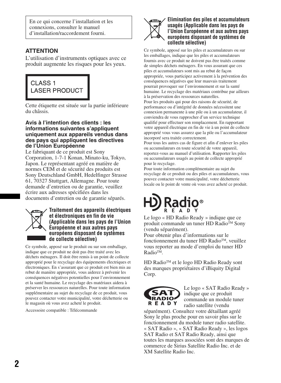 (vendu séparément). Pour obtenir plus d’informations sur le fonctionnement du tuner HD RadioTM, veuillez vous reporter au mode d’emploi du tuner HD RadioTM. HD RadioTM et le logo HD Radio Ready sont des marques propriétaires d’iBiquity Digital Corp. Le logo « SAT Radio Ready » indique que ce produit commande un module tuner radio satellite (vendu séparément). Consultez votre détaillant agréé Sony le plus proche pour en savoir plus sur le fonctionnement du module tuner radio satellite. « SAT Radio », « SAT Radio Ready », les logos SAT Radio et SAT Radio Ready, ainsi que toutes les marques associées sont des marques de commerce de Sirius Satellite Radio Inc. et de XM Satellite Radio Inc.