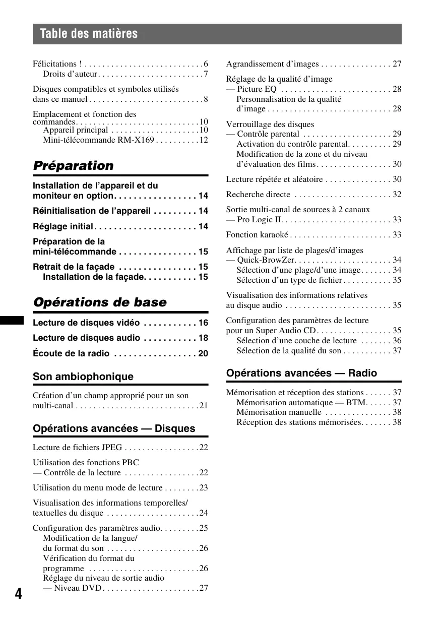 Appareil auxiliaire . . . . . . . . . . . . . . . . . . . . . . 51 Changeur CD . . . . . . . . . . . . . . . . . . . . . . . . . . 52 Satellite de commande RM-X4S . . . . . . . . . . . 53