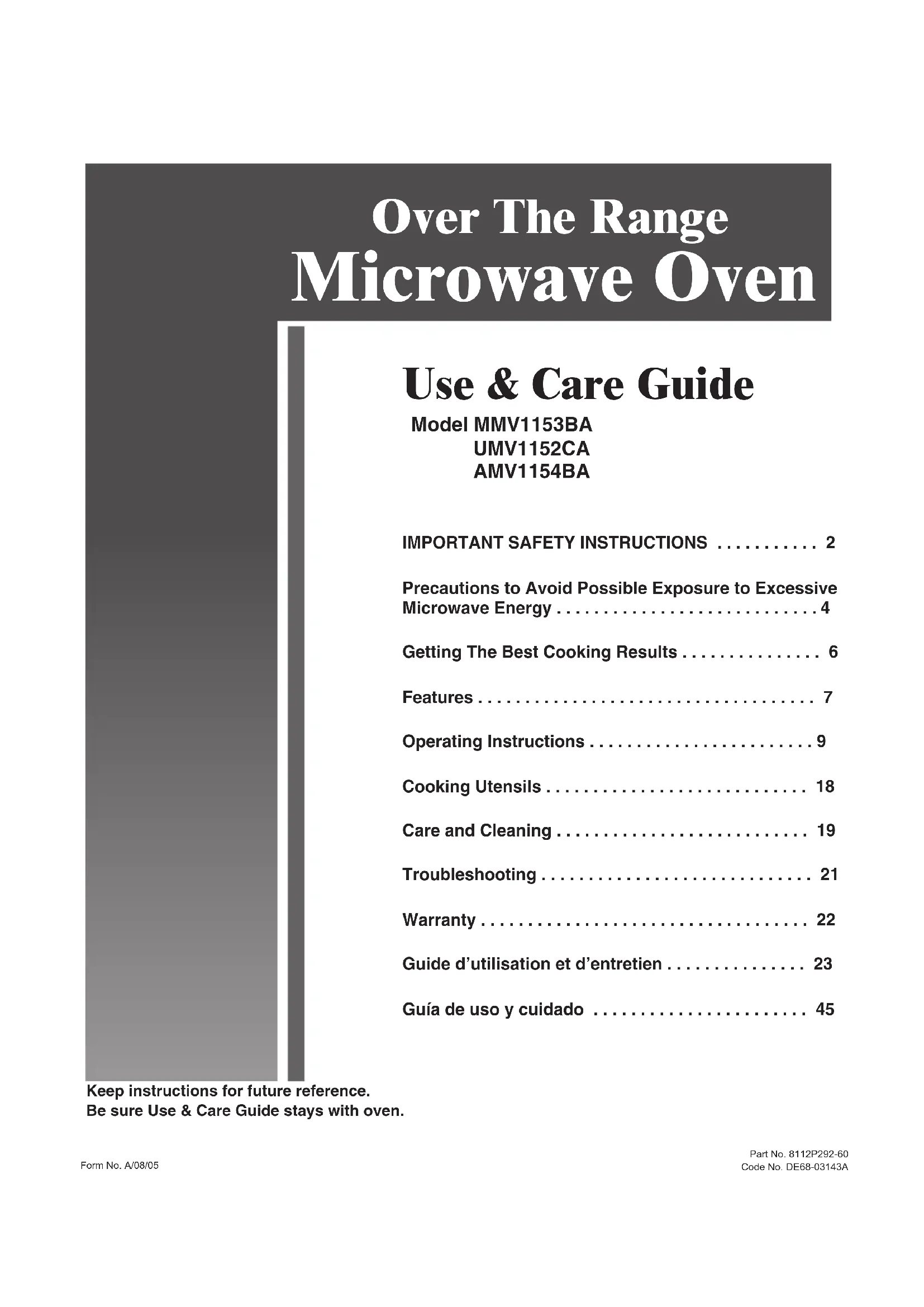 - Les guides d’utilisation, les manuels de service et les renseignements sur les pièces sont disponibles auprès du service à la clientèle de Maytag Services LLC. Remarques: Veillez à fournir l’information suivante lorsque vous communiquez avec nous au sujet d’un problème: a. Vos nom, adresse et numéro de téléphone; b. Numéro de modèle et numéro de série de l’appareil; c. Nom et adresse du détaillant avec la date l’appareil acheté ; d. Description détaillée du problème observé; e. Preuve d’achat (facture de vente).Conserve las instrucciones para consultas futuras. Asegúrese de que esta Guía de uso y cuidado se conserve con el horno. N° formulaire : A/08/05 Guía de uso y cuidado Modelo MMV1153BA UMV1152CA AMV1154BA Horno de microondas para instalar sobre la estufa