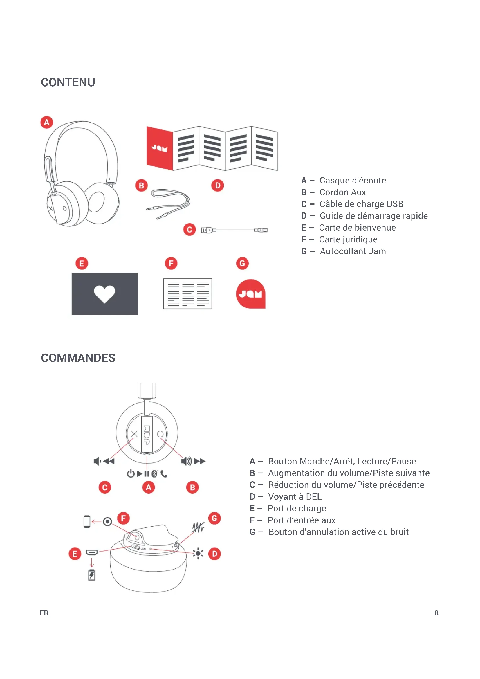 Ce symbole indique que les batteries ne doivent pas être éliminées dans les déchets domestiques, car ils contiennent des substances qui peuvent être nocives pour l’environnement et la santé. Prière d’éliminer les batteries auprès de sites de collecte désignés. Par les présentes, FKA Brands Ltd déclare que cet appareil radio est conforme aux exigences essentielles et aux autres dispositions pertinentes de la directive 2014/53/UE. La Déclaration de conformité peut être obtenue à l’adresse uk.jamaudio.com/DoC. Tous droits réservés. IB-HXHP303EN 13 “Out There” HX-HP303 Libro de Instrucciones14 CONTENIDO A – Audífonos B – Cable auxiliar C – Cable de carga USB D – Guía de inicio rápido E – Tarjeta de bienvenida F – Tarjeta legal G – Etiqueta de Jam CONTROLES A – Botón Encendido/Apagado (On/Off), Reproducir/Pausar B – Subir Volumen/Siguiente Pista C – Bajar Volumen/Pista Previa D – Indicador de luz LED Light E – Puerto de carga F – Puerto de entrada auxiliar G – Interruptor ANC ES15 CONFIGURACIÓN