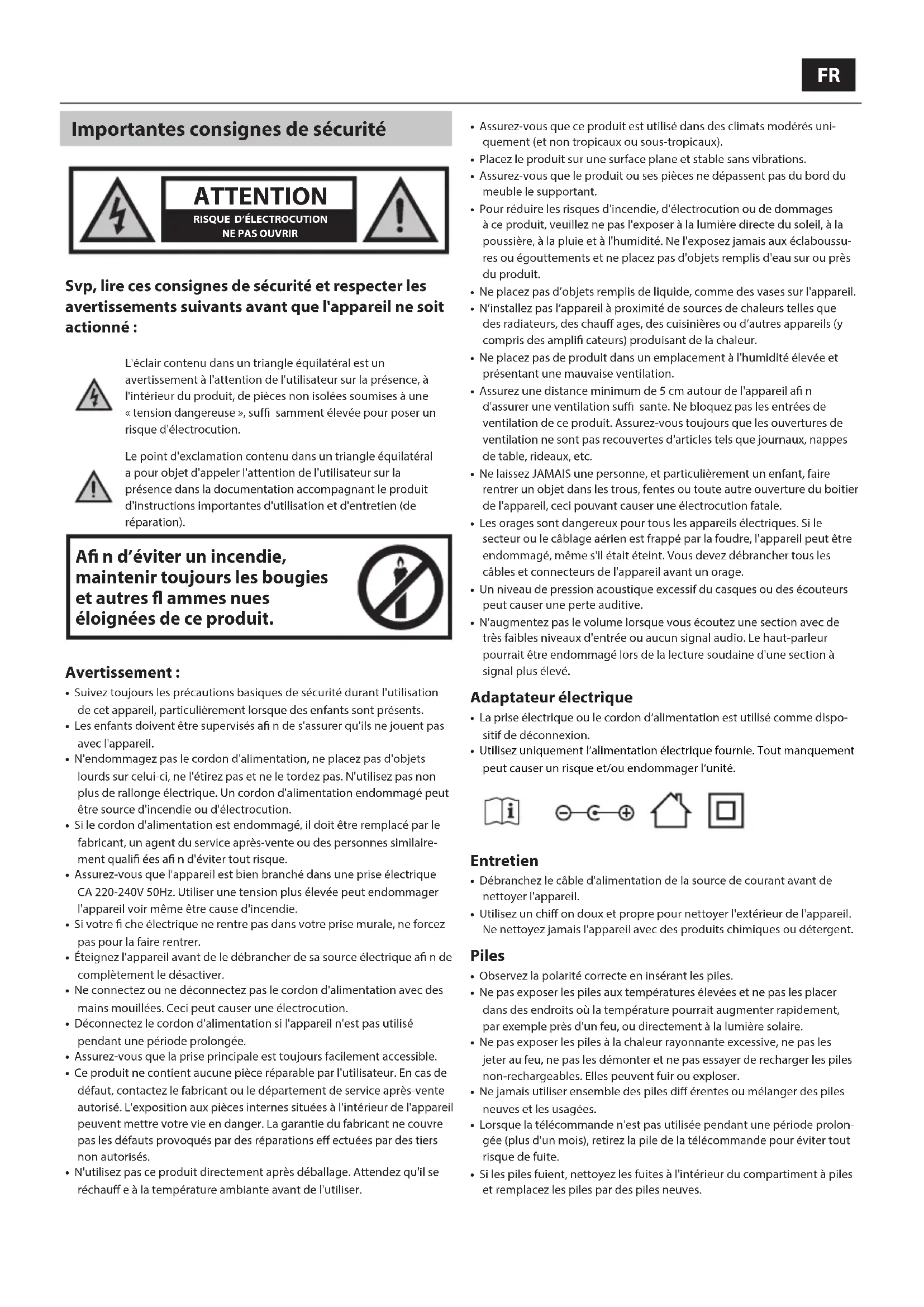 Svp, lire ces consignes de sécurité et respecter les avertissements suivants avant que l'appareil ne soit actionné : L'éclair contenu dans un triangle équilatéral est un avertissement à l'attention de l'utilisateur sur la présence, à l'intérieur du produit, de pièces non isolées soumises à une « tension dangereuse », su samment élevée pour poser un risque d'électrocution.Le point d'exclamation contenu dans un triangle équilatéral a pour objet d'appeler l'attention de l'utilisateur sur la présence dans la documentation accompagnant le produit d'instructions importantes d'utilisation et d'entretien (de réparation). A n d’éviter un incendie, maintenir toujours les bougies et autres ammes nues éloignées de ce produit.