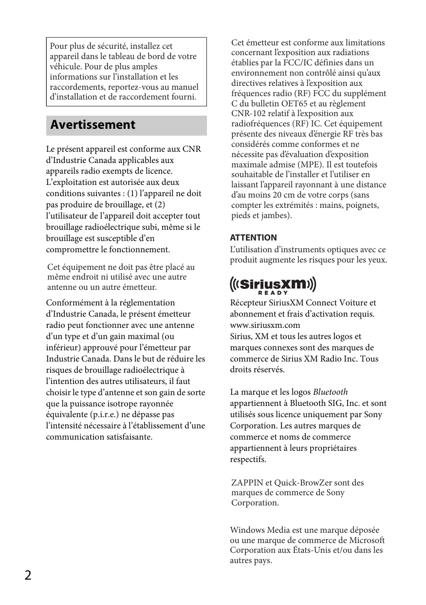 Pour plus de sécurité, installez cet appareil dans le tableau de bord de votre véhicule. Pour de plus amples informations sur l’installation et les raccordements, reportez-vous au manuel d’installation et de raccordement fourni. Avertissement Le présent appareil est conforme aux CNR d’Industrie Canada applicables aux appareils radio exempts de licence. L’exploitation est autorisée aux deux conditions suivantes : (1) l’appareil ne doit pas produire de brouillage, et (2) l’utilisateur de l’appareil doit accepter tout brouillage radioélectrique subi, même si le brouillage est susceptible d’en compromettre le fonctionnement. Cet équipement ne doit pas être placé au même endroit ni utilisé avec une autre antenne ou un autre émetteur. Conformément à la réglementation d’Industrie Canada, le présent émetteur radio peut fonctionner avec une antenne d’un type et d’un gain maximal (ou inférieur) approuvé pour l’émetteur par Industrie Canada. Dans le but de réduire les risques de brouillage radioélectrique à l’intention des autres utilisateurs, il faut choisir le type d’antenne et son gain de sorte que la puissance isotrope rayonnée équivalente (p.i.r.e.) ne dépasse pas l’intensité nécessaire à l’établissement d’une communication satisfaisante. Cet émetteur est conforme aux limitations concernant l’exposition aux radiations établies par la FCC/IC définies dans un environnement non contrôlé ainsi qu’aux directives relatives à l’exposition aux fréquences radio (RF) FCC du supplément C du bulletin OET65 et au règlement CNR-102 relatif à l’exposition aux radiofréquences (RF) IC. Cet équipement présente des niveaux d’énergie RF très bas considérés comme conformes et ne nécessite pas d’évaluation d’exposition maximale admise (MPE). Il est toutefois souhaitable de l’installer et l’utiliser en laissant l’appareil rayonnant à une distance d’au moins 20 cm de votre corps (sans compter les extrémités : mains, poignets, pieds et jambes). ATTENTION L’utilisation d’instruments optiques avec ce produit augmente les risques pour les yeux. Récepteur SiriusXM Connect Voiture et abonnement et frais d’activation requis. www.siriusxm.com Sirius, XM et tous les autres logos et marques connexes sont des marques de commerce de Sirius XM Radio Inc. Tous droits réservés. La marque et les logos Bluetooth appartiennent à Bluetooth SIG, Inc. et sont utilisés sous licence uniquement par Sony Corporation. Les autres marques de commerce et noms de commerce appartiennent à leurs propriétaires respectifs. ZAPPIN et Quick-BrowZer sont des marques de commerce de Sony Corporation. Windows Media est une marque déposée ou une marque de commerce de Microsoft Corporation aux États-Unis et/ou dans les autres pays.