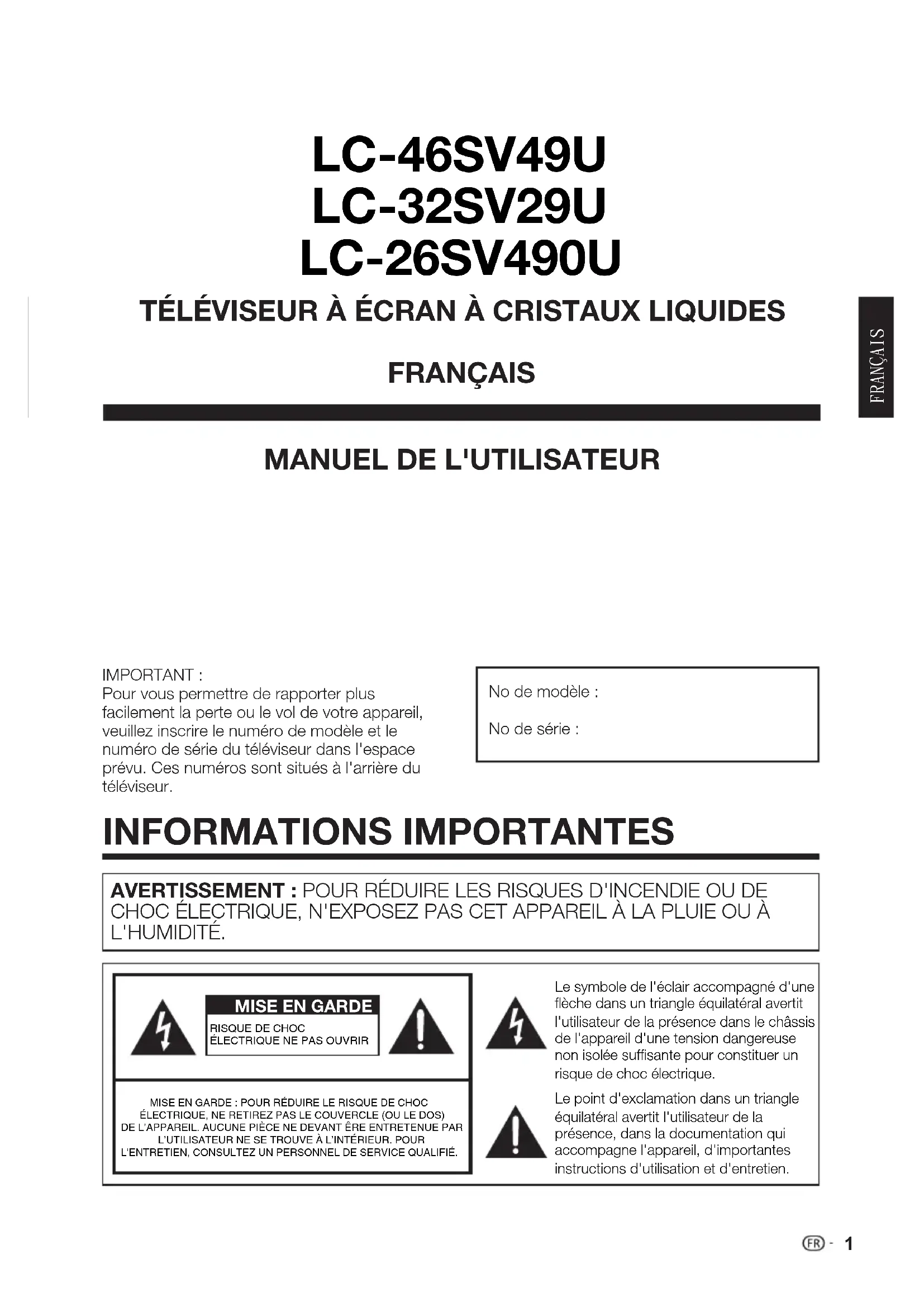 CHOC ÉLECTRIQUE, N'EXPOSEZ PAS CET APPAREIL À LA PLUIE OU À L'HUMIDITÉ. LC-26SV490U LC-32SV29U LC-46SV49U MISE EN GARDERISQUE DE CHOC ÉLECTRIQUE NE PAS OUVRIRMISE EN GARDE : POUR RÉDUIRE LE RISQUE DE CHOC ÉLECTRIQUE, NE RETIREZ PAS LE COUVERCLE (OU LE DOS) DE L’APPAREIL. AUCUNE PIÈCE NE DEVANT ÊRE ENTRETENUE PARL’UTILISATEUR NE SE TROUVE À L’INTÉRIEUR. POUR L'ENTRETIEN, CONSULTEZ UN PERSONNEL DE SERVICE QUALIFIÉ. Le symbole de l'éclair accompagné d'une flèche dans un triangle équilatéral avertit l'utilisateur de la présence dans le châssis de l'appareil d'une tension dangereuse non isolée suffisante pour constituer un risque de choc électrique.Le point d'exclamation dans un triangle équilatéral avertit l'utilisateur de la présence, dans la documentation qui accompagne l'appareil, d'importantes instructions d'utilisation et d'entretien.2