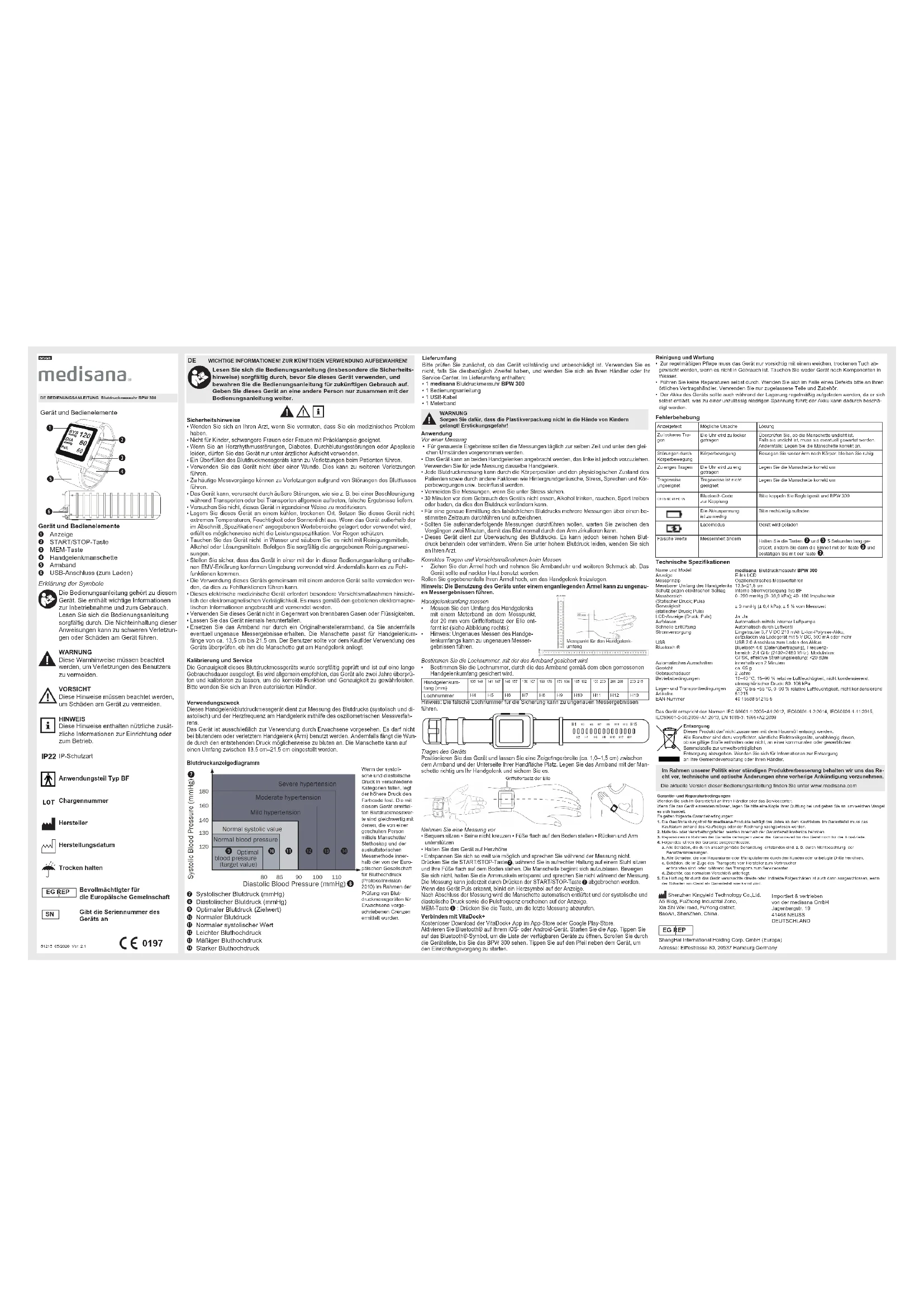 Lorsque les pressions systolique et diasto-lique tombent dans des catégories diffé-rentes, la pression la plus élevée détermine le code de couleur. Les mesures de tension artérielle déterminées avec cet appareil sont équivalentes à celles obtenues par un observateur qualié utilisant la méthode d'auscultation par brassard/stéthoscope, dans les limites pres-crites par la révision de 2010 du protocole international de la Société européenne d'hypertension arté-rielle pour la validation des tensiomètres pour adultes.Point de mesurede la circonférence du poignetProcédé styloïde du cubitusLa version actuelle de ce mode d’emploi est disponible sur www.medisana.comConformément à notre politique d'amélioration continue des produits, nous nous réservons le droit d'apporter des modications techniques et visuelles sans préavis.ÉliminationCe produit ne doit pas être éliminé avec les ordures ménagères. Tous les utilisateurs sont tenus de remettre tous les appareils électriques ou électroniques,qu'ils contiennent ou non des substances toxiques, à un point de collecte municipal ou commercial, an que ceux-ci puissent être éliminés d'une manière écologiquement acceptable. Pour plus d'informations sur l'élimination des déchets, adressez-vous à votre municipalité ou à votre revendeur.L’appareil est conforme aux normes IEC 60601-1:2005+A1:2012, IEC60601-1-2:2014, IEC60601-1-11:2015,IEC80601-2-30:2009+A1:2013, EN 1060-3: 1995+A2:2009Lea atentamente el manual de instrucciones antes de utilizar este aparato, en especial las indicaciones de seguridad, y guárdelo para consultas futuras. Si entrega el aparato a otra persona, es impor- tante entregarle también este manual de instrucciones. ES ¡INFORMACIÓN IMPORTANTE! ¡CONSERVAR PARA FUTURAS CONSULTAS!Indicaciones de seguridad• Si sospecha que puede tener algún problema médico, póngase en contacto con su médico.• El aparato no debe usarse en niños, embarazadas o pacientes preeclámpticas.• Si sufre de arritmia, diabetes, problemas de circulación sanguínea o apoplejía, utilice el aparato solo con la supervisión de un médico.• El sobreinado prolongado del tensiómetro causará lesiones al paciente.• No utilice el aparato sobre una herida, ya que podría agravar la lesión.