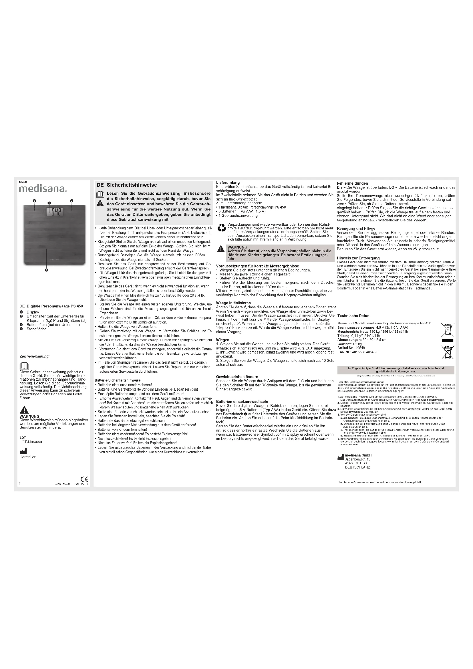 PS 450 - Balance MEDISANA - Notice d'utilisation et mode d'emploi gratuit