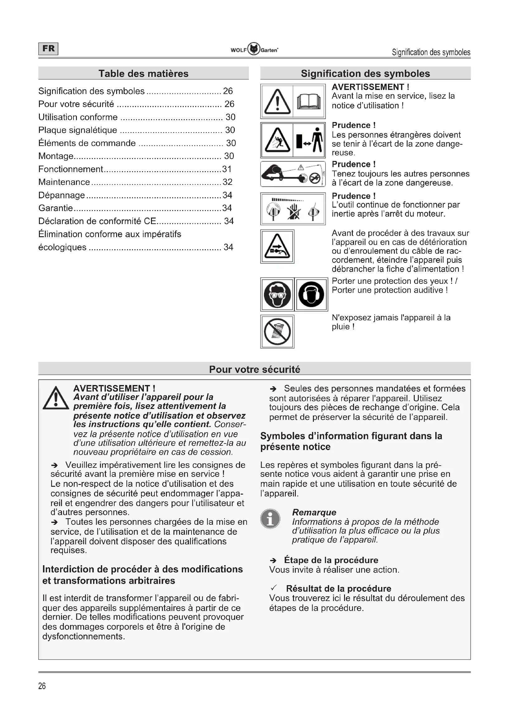 AVERTISSEMENT ! Avant la mise en service, lisez la notice d’utilisation ! Prudence ! Les personnes étrangères doivent se tenir à l’écart de la zone dange- reuse. 360° Prudence ! Tenez toujours les autres personnes à l’écart de la zone dangereuse. Prudence ! L’outil continue de fonctionner par inertie après l’arrêt du moteur. Avant de procéder à des travaux sur l’appareil ou en cas de détérioration ou d’enroulement du câble de rac- cordement, éteindre l’appareil puis GpEUDQFKHUOD¿FKHG¶DOLPHQWDWLRQ Porter une protection des yeux ! / Porter une protection auditive ! N'exposez jamais l'appareil à la pluie ! Table des matièresPour votre sécurité