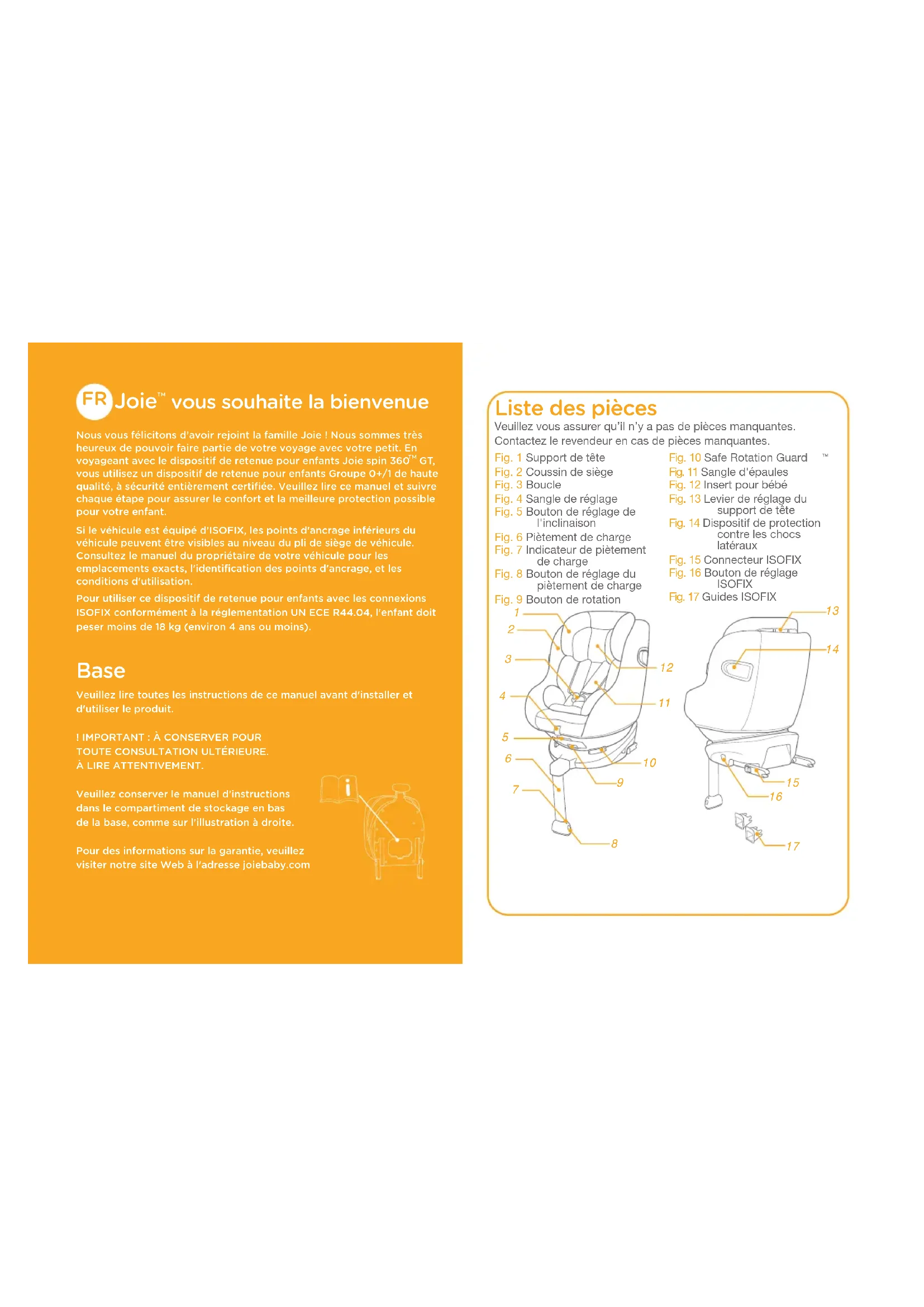 GT, vous utilisez un dispositif de retenue pour enfants Groupe 0+/1 de haute qualité, à sécurité entièrement certifiée. Veuillez lire ce manuel et suivre chaque étape pour assurer le confort et la meilleure protection possible pour votre enfant.Si le véhicule est équipé d'ISOFIX, les points d'ancrage inférieurs du véhicule peuvent être visibles au niveau du pli de siège de véhicule. Consultez le manuel du propriétaire de votre véhicule pour les emplacements exacts, l'identification des points d'ancrage, et les conditions d'utilisation.Pour utiliser ce dispositif de retenue pour enfants avec les connexions ISOFIX conformément à la réglementation UN ECE R44.04, l'enfant doit peser moins de 18kg (environ 4 ans ou moins). Base Veuillez lire toutes les instructions de ce manuel avant d'installer et d'utiliser le produit.! IMPORTANT : À CONSERVER POUR TOUTE CONSULTATION ULTÉRIEURE.À LIRE ATTENTIVEMENT.Veuillez conserver le manuel d'instructions dans le compartiment de stockage en bas de la base, comme sur l'illustration à droite.Pour des informations sur la garantie, veuillez visiter notre site Web à l'adresse joiebaby.com Liste des pièces Veuillez vous assurer qu’il n’y a pas de pièces manquantes. Contactez le revendeur en cas de pièces manquantes.