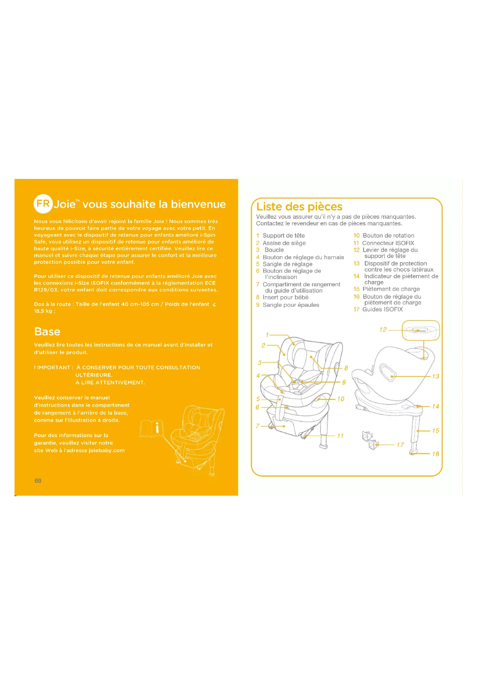 vous souhaite la bienvenue Nous vous félicitons d’avoir rejoint la famille Joie ! Nous sommes très heureux de pouvoir faire partie de votre voyage avec votre petit. En voyageant avec le dispositif de retenue pour enfants amélioré i-Spin Safe, vous utilisez un dispositif de retenue pour enfants amélioré de haute qualité i-Size, à sécurité entièrement certifiée. Veuillez lire ce manuel et suivre chaque étape pour assurer le confort et la meilleure protection possible pour votre enfant.Pour utiliser ce dispositif de retenue pour enfants amélioré Joie avec les connexions i-Size ISOFIX conformément à la réglementation ECE R129/03, votre enfant doit correspondre aux conditions suivantes.Dos à la route : Taille de l'enfant 40 cm-105 cm / Poids de l'enfant18,5 kg ; Base Veuillez lire toutes les instructions de ce manuel avant d'installer et d'utiliser le produit.! IMPORTANT : À CONSERVER POUR TOUTE CONSULTATION ULTÉRIEURE.À LIRE ATTENTIVEMENT.Veuillez conserver le manuel d'instructions dans le compartiment de rangement à l'arrière de la base, comme sur l'illustration à droite.Pour des informations sur la garantie, veuillez visiter notre site Web à l'adresse joiebaby.com Liste des pièces 1 Support de tête2 Assise de siège3 Boucle4 Bouton de réglage du harnais5 Sangle de réglage6 Bouton de réglage de l'inclinaison7 Compartiment de rangement du guide d’utilisation8 Insert pour bébé9 Sangle pour épaules10 Bouton de rotation11 Connecteur ISOFIX12 Levier de réglage du support de tête13 Dispositif de protection contre les chocs latéraux14 Indicateur de piètement de charge15 Piètement de charge16 Bouton de réglage du piètement de charge17 Guides ISOFIXVeuillez vous assurer qu’il n’y a pas de pièces manquantes. Contactez le revendeur en cas de pièces manquantes.