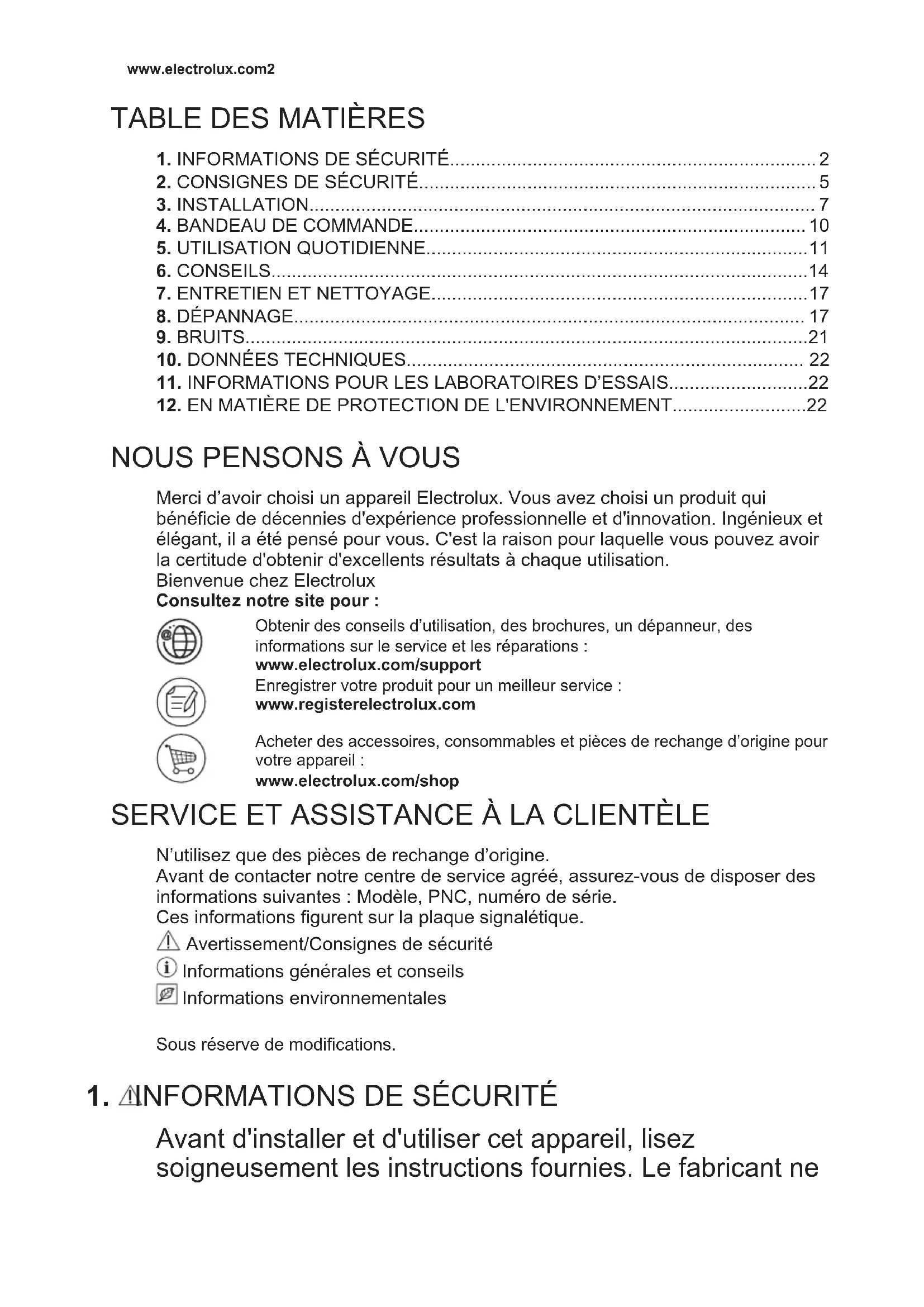 Merci d’avoir choisi un appareil Electrolux. Vous avez choisi un produit qui bénéficie de décennies d'expérience professionnelle et d'innovation. Ingénieux et élégant, il a été pensé pour vous. C'est la raison pour laquelle vous pouvez avoir la certitude d'obtenir d'excellents résultats à chaque utilisation. Bienvenue chez Electrolux Consultez notre site pour : Obtenir des conseils d’utilisation, des brochures, un dépanneur, des informations sur le service et les réparations : www.electrolux.com/support Enregistrer votre produit pour un meilleur service : www.registerelectrolux.com Acheter des accessoires, consommables et pièces de rechange d’origine pour votre appareil : www.electrolux.com/shop
